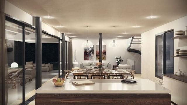 On the ground floor there is a double guest bedroom and bathroom located off of a double height entrance hall and leading into the flexible living space where owners can opt for a closed or open plan kitchen which in turn leads on to the dining area and lounge before opening up to the terrace and decked swimming pool.