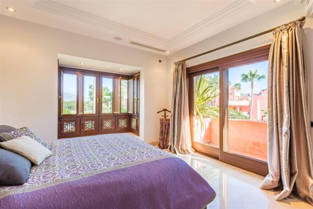 Beachfront luxury penthouse for sale in the New Golden Mile Estepona. This penthouse is located in Torre Bermeja, one of the most exclusive gated developments of the New Golden Mile area with nice landscaped gardens, gym, sauna, 24h security service, tropical style pools and indoor heated pool and everything else that the Mediterranean lifestyle can offer. Excellent sandy beaches and all amenities are nearby, lovely resort Estepona is 5 minutes away and glamorous Puerto Banús is only in 10 minutes´ drive. This property offers 3 bedrooms en-suite (one with indoor Jacuzzi); modern fully equipped kitchen; large and bright lounge with dining area and access to terrace, bar area, underground parking and a private storage room. Its interior design is functional and fabulous. Excellent creamy marble floors, natural colours palette with bright accents, high quality furniture and stylish accessories, modern air conditioning and alarm systems, central heating, fireplace, BBQ area, fitted wardrobes, home automation system, Jacuzzi - it has all the imaginable comfort you are looking for. Several nicely furnished large terraces (130m2) and a solarium terrace on top with al fresco dining facilities and an outdoor Jacuzzi enjoy spectacular views over the gardens and blue Mediterranean Sea towards the North African coastline.