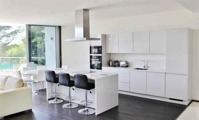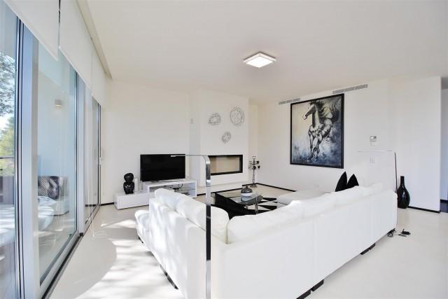 Exclusive modern townhouse for sale on the Marbella Golden Mile. Located in a prime position and boasting spectacular views over the Mediterranean Coast line, this prestigious property was recently finished and the complex have been awarded The Best Architecture Bentley Award and consists of only 58 private properties. The urbanization offers security, indoor pool, jacuzzi, gym and is surrounded by a pine forest. The property have 3 levels and is disributed as follows: - On the lower level: private garage with a laundry area. On the ground level open plan lounge with American kitchen leading on to the terrace with open sea views, guest toilet and additional guest quarters with a shower and private entrance. On the top level two en-suite bedrooms with large bathrooms, both with built in wardrobes and terraces, spacious and bright The property boasts domotics, underfloor heating throughout.