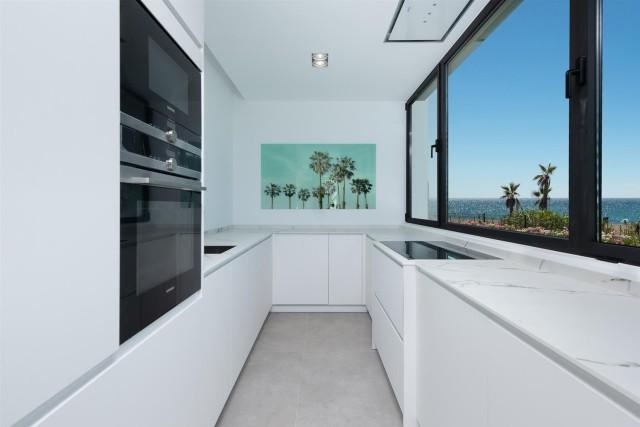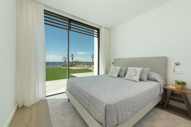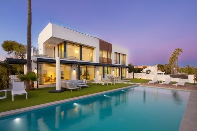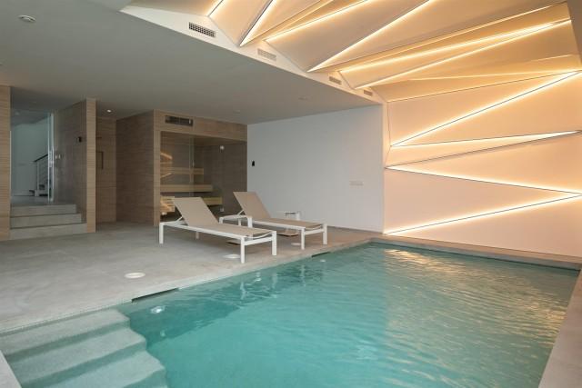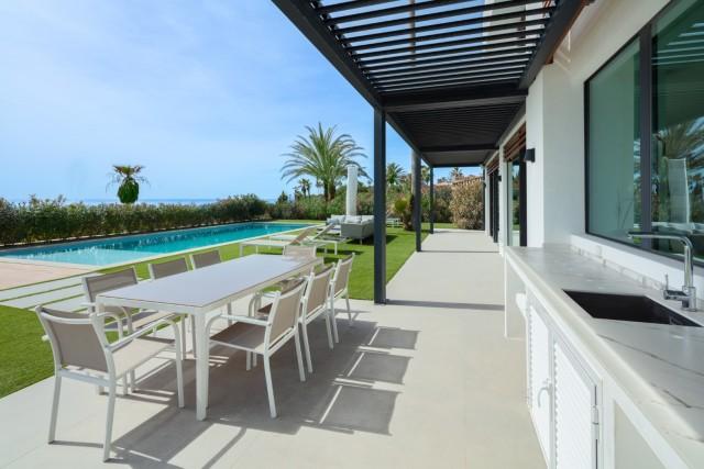 Frontline beach, designer villa for sale in Estepona. Stunning beachfront luxurious villa set in a magnificent garden with a large outdoor swimming pool and panoramic sea views. Inside, the basement level offers a luxurious spa with indoor heated swimming pool and sauna, and the roof top terrace offers a chill-out zone with a Jacuzzi on a wooden deck.