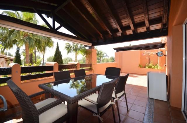 There are two sets of sliding patio doors leading out to the large terrace. One side has a Gazebo style area for dining. The other side of the terrace has views of the sea through the attractive palm trees.