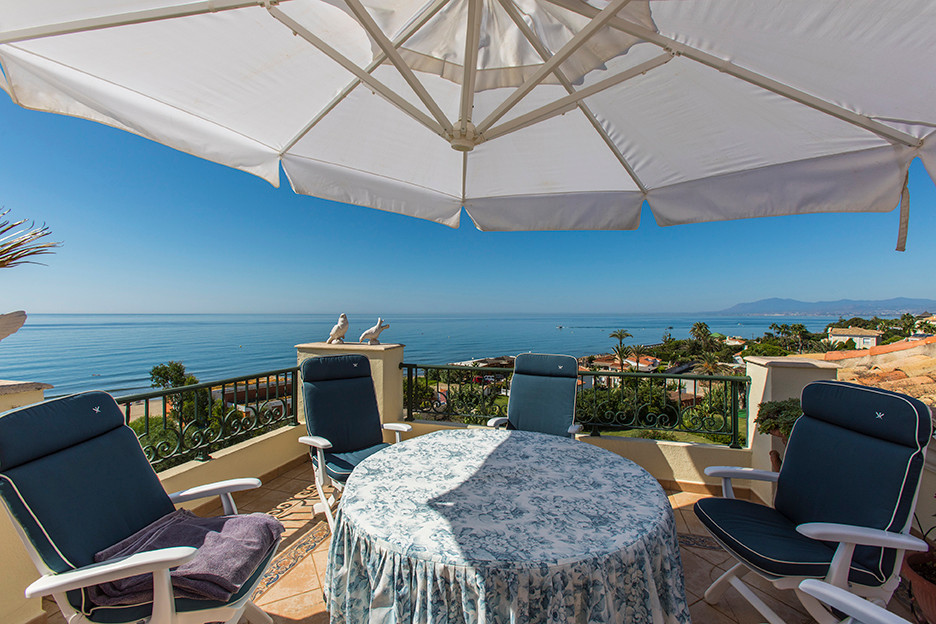 Amazing front line beach penthouse in Hacienda Playa Phase 2 in Elviria, East Marbella. This stunning penthouse offers the most incredible sea views and spectacular sunsets every evening. The apartment offers on one level three bedrooms, two bathrooms, guest toilet, large and bright kitchen with separate utility room, very large living room and dining room with access to sunny and partly covered and glazed terrace with southwest orientation. There is a roof terrace boasting breathtaking views of the coast and lots of privacy. Gated complex with gardens and pool. Sold fully furnished, new kitchen, marble floors, new air conditioning hot and cold, underfloor heating in the master bathroom and including as well storage room and underground parking space. Lift. Within walking distance to all local amenities.