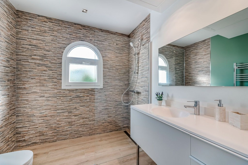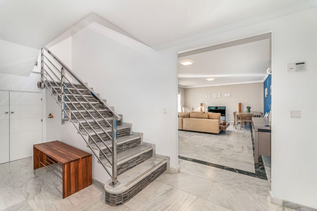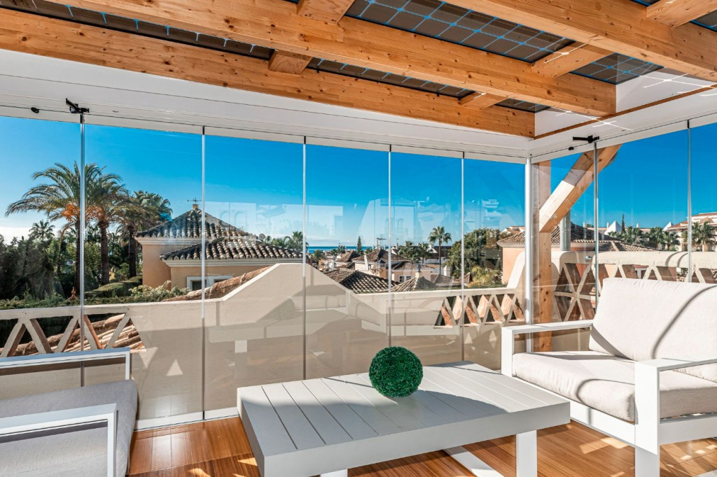 This charming villa with heated pool is located in the famous residential area of Bahía de Marbella just a few meters from the beach. The urbanization is exclusive due to its elegance, its 24 hour security service and its unbeatable location in front of the most beautiful beaches in Marbella, not to mention the famous "La Cabane" beach club nearby. The villa has been completely renovated and is distributed over two floors. The ground floor consists of a modern kitchen with dining area and laundry room, a spacious living-dining room that opens onto the covered glazed terrace, a bedroom with an en-suite bathroom. The upper floor offers two bedrooms and two bathrooms, one of them en-suite. In addition, the villa has a large glazed terrace to enjoy the mild climate of Marbella and the sea views outdoors all year round. The villa is equipped with air conditioning h/c, under-floor heating in the bathrooms, marble floors, double glazing, solar energy, a garage for one car and a storage room.