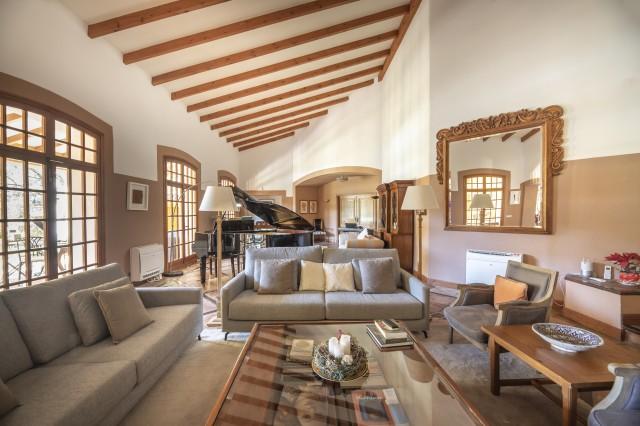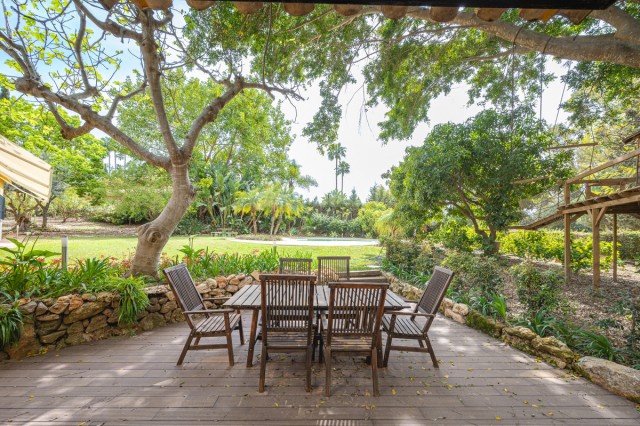 Tiles floor and wooden beams leading to a beautiful porche and the mature manicured garden with swimming pool, tree house and BBQ area.