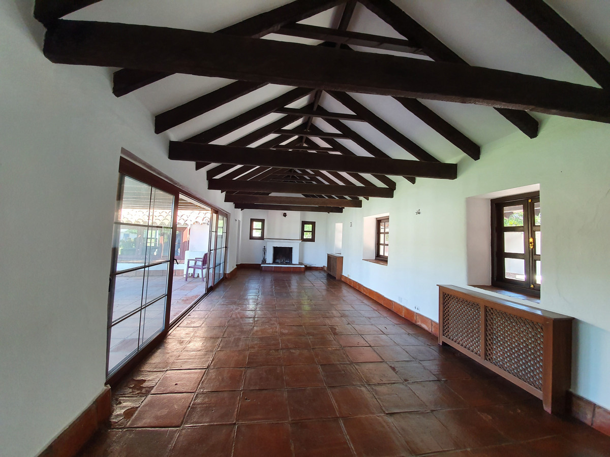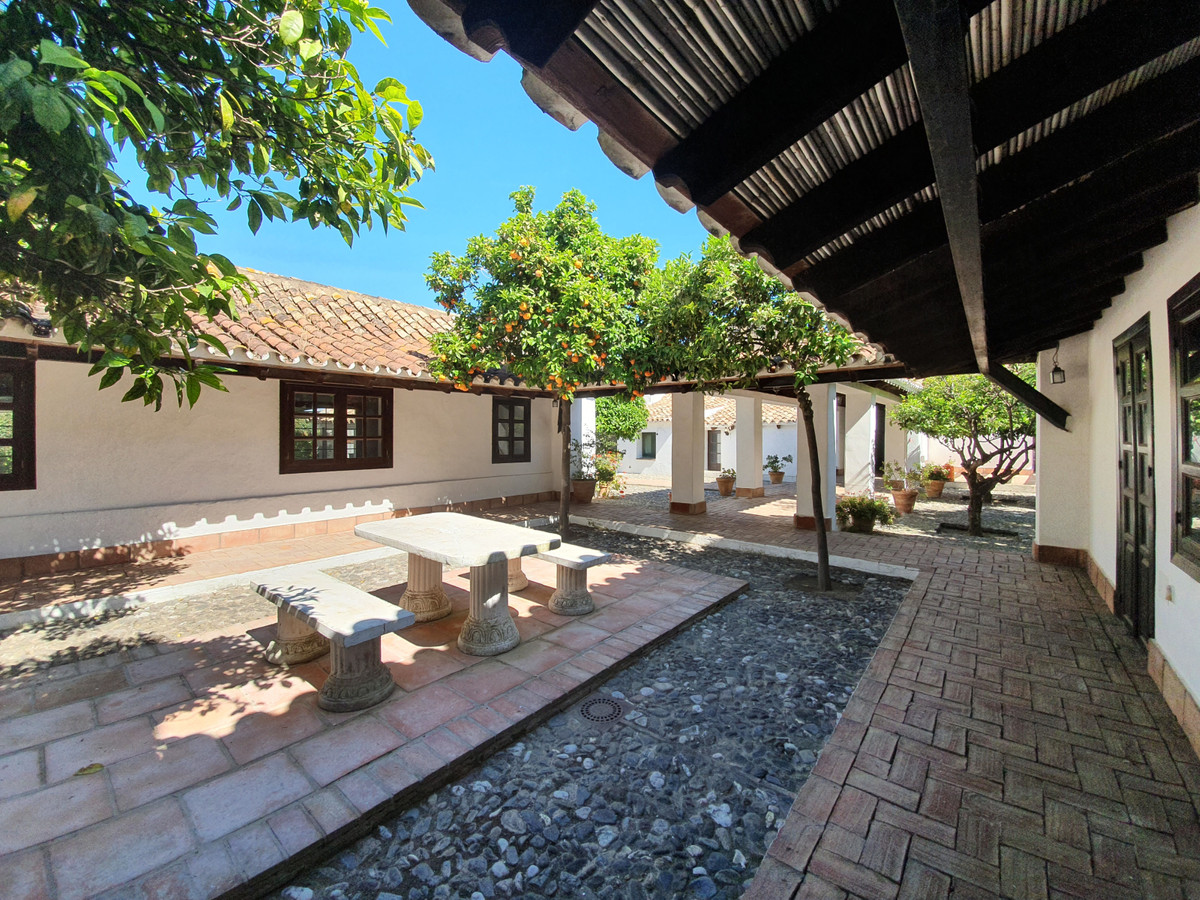 Gorgeous colonial traditional Andalusian style farmhouse located in the best part of San Enrique de Guadiaro, only five minutes from Sotogrande, the beach and all the Polo facilities in the area are literally on your doorstep, such as Ayala, which makes it ideal for those interested and professionals in this area of this sport or horse lovers and countrylovers in general. The farmhouse is a restored 17th century building of 2.5 hectares. The main house is approximately 450 years old. It is a very large main house, but still feels nice and cozy. This is a two-storey closed country house with a central patio, large gardens, parking area for numerous cars. It has an entrance hall with stairs to go up to the upper floor, library, piano room, living room with covered terrace, kitchen with an incredible size of 6x10 meters, pantry with patio laundry. Summer dining room for 14 people or more. Private pool of 6x15 meters. Cinema. Master bedroom with en suite bathroom and dressing room.