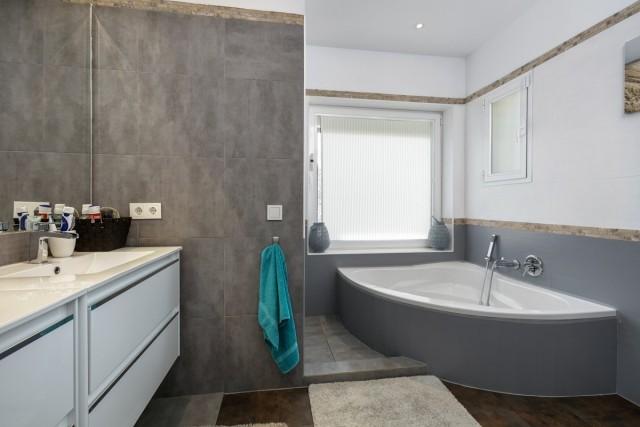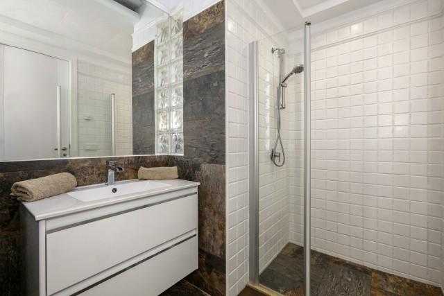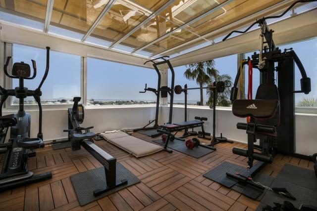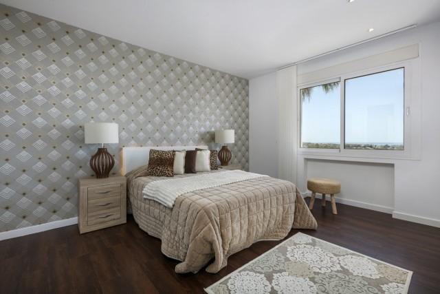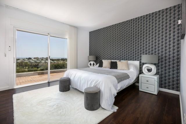 Frontline golf villa for sale in La Alquería, Benahavis, consisting of a living room with fireplace, a dining room, 4 bedrooms, 4 bathrooms, a fully fitted kitchen and terraces. Pool. Parking. Gym. Plot: 667m2. Sea and golf views.