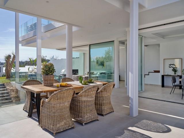 The plot of the eight villas is located in the quiet area of Marbella. This location has schools, kindergartens, the El Mirador Paddle Tennis Club and the Monte Paraiso Country Club, all within a few minutes' drive from the centre of Marbella. The parking and entrances to each villa are located on the Basement level, with a separate lift for convenience. The Patio Floor offers ample space with natural light in 2 rooms for a gymnasium, games room or library, along with a full bathroom. The Ground Floor is a large open space that includes a living room, dining room and kitchen, with a guest toilet. The First Floor has 3 bedrooms, 3 bathrooms and terraces, and the Terrace Floor offers a toilet, pergola and a large solarium with views of the Mediterranean. Floor to ceiling sliding windows, with recessed rails in the floor tiles, connect the interior and exterior spaces and maximise natural light. Four villas are south-east facing and the other four south-west facing, all with spectacular sea views.