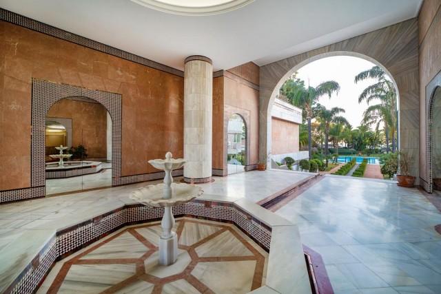 Beachfront Luxury Duplex Apartment for sale in Puerto Banus Marbella. A frontline beach property with 3 bedrooms and 4 bathrooms. The duplex ground floor apartment features an impressive palace-style entrance hall leading to an amazing open plan living area on the lower level and a private area on the upper level composed of 3 bedrooms with 3 en-suite bathrooms.