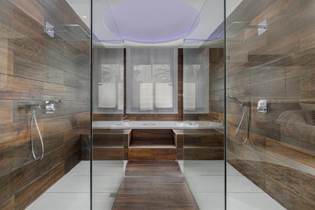The master suite is split into 3 areas, His and Hers dressing areas on each side of the entrance leading to the sleeping area with and open sea view and access to a sunny terrace, and the bathroom area with the His and Hers showers, a jacuzzi bath with sea view and a seperate toilet.