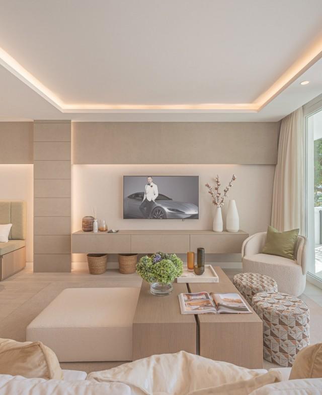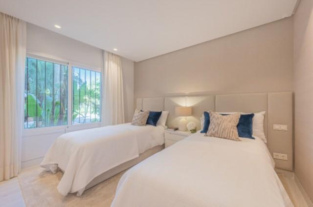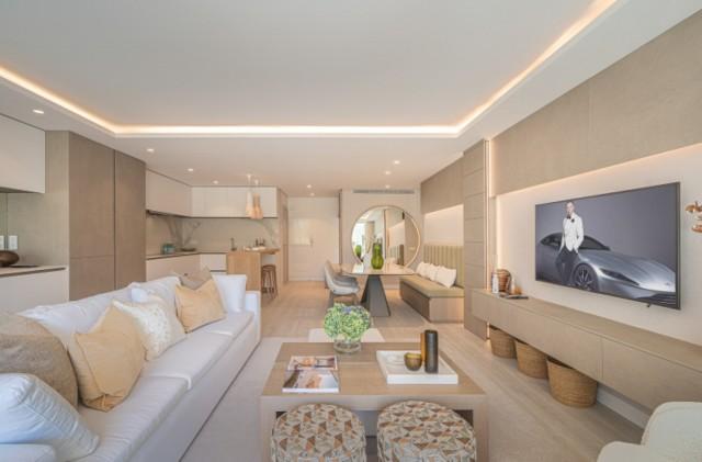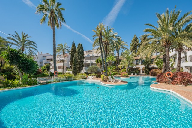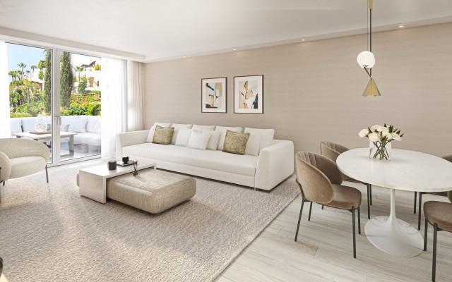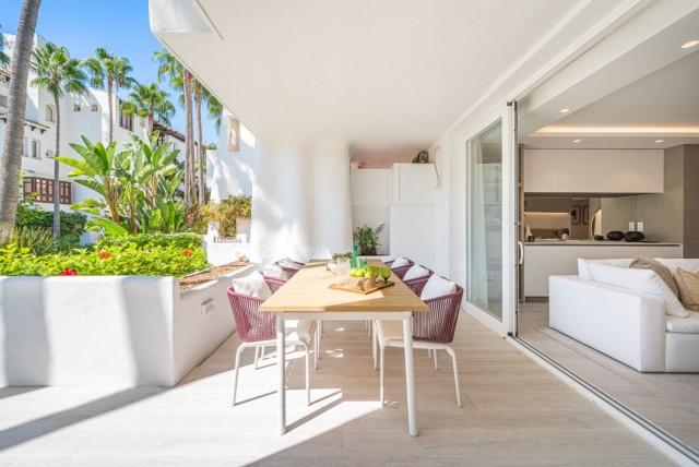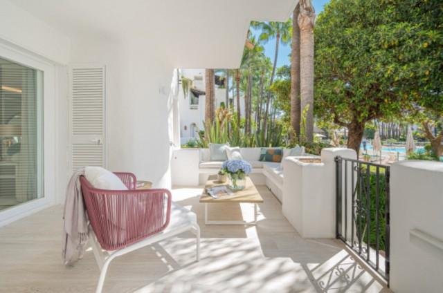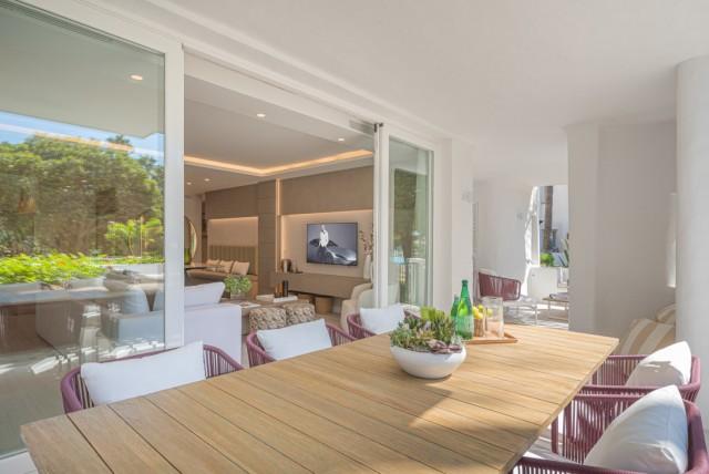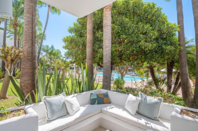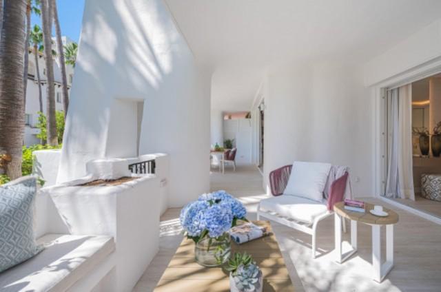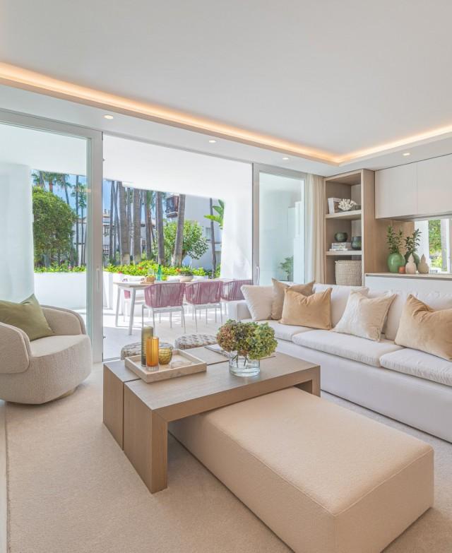 Luxury Groundfloor Apartment for sale in Marbella Golden Mile. Located on a beachfront complex in the most prestigious address in Marbella, this stylish, newly renovated ground floor three bedroom apartment, set in the heart of the luxurious Puente Romano Resort.