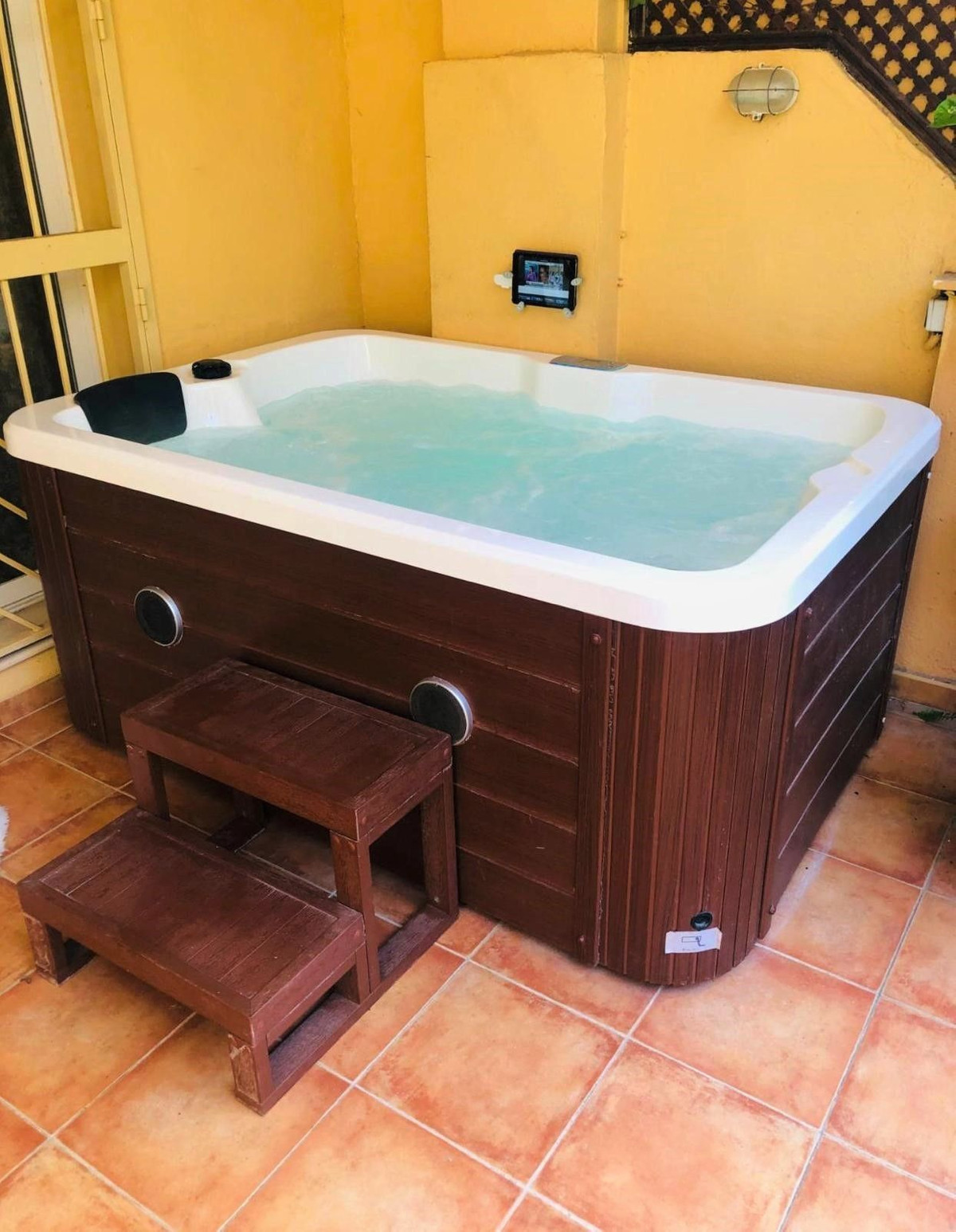 Air conditioning. Nice covered terrace, with nice furniture, barbecue and jacuzzi.