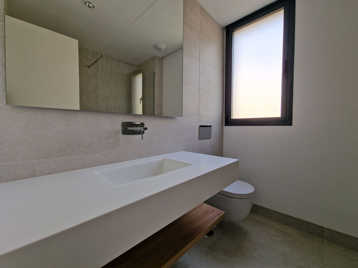 Urb. Artola Homes!!! Discover the charm of this 2-bedroom luxury apartment nestled in the coveted enclave of Artola, just a delightful 20-minute stroll from the beach. The main allure of this residence lies in its prime location in a luxury complex boasting a gym and indoor pool. As you step inside, a discreet laundry room to your right, provides ample shelf-space for linen and the washing machine and tumble dryer. The 2 bedrooms are all conveniently located ahead of you (one of which is ensuite), and the kitchen/dining area is immediately to your left, leading out to the spacious terrace. The apartment is equipped with an energy-efficient heat pump system that bestows hot or cold air according to your needs. Both bathrooms also have underfloor-heating. Easy access to the rooftop terrace, where you can enjoy the sun throughout the year. Parking is a breeze with not one but two dedicated spaces – an indoor space for your vehicle and an outdoor convenience for guests. This flat is nestled within a secure gated complex, granting you exclusive access to a cutting-edge gym for your fitness pursuits. Step into the outdoors to find a spacious pool area, perfect for unwinding in the Mediterranean sun. For those cooler days, retreat to the heated indoor pool.