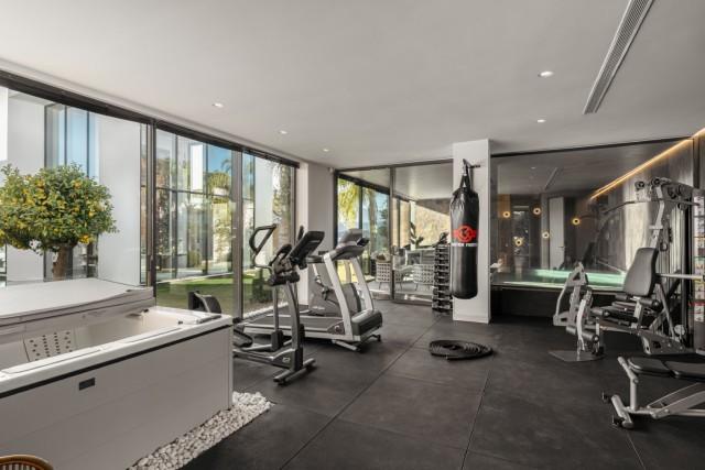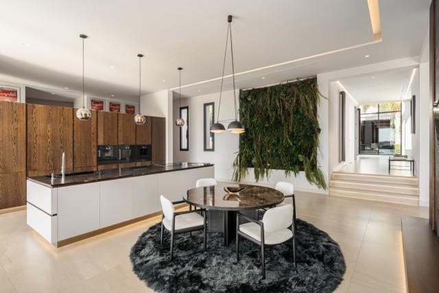 The forward view as you open the front door rewards you with one of the true standout features of the property – the lavish central atrium, housing grass, trees and a walkway – flanked by the rest of the single-floor living areas. As well as the six bedrooms and nine bathrooms on offer, this modern Marbella mansion features luxury comforts, including a cinema room, gym and spa facilities, indoor and outdoor swimming pools, a spacious seven-car garage and separate staff quarters.