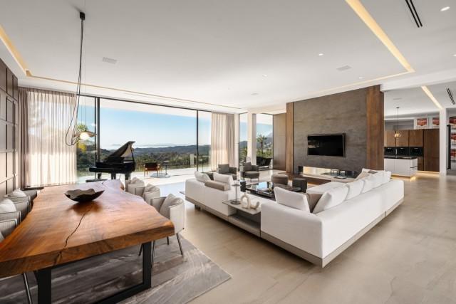 Modern Frontline Golf Villa for sale in Benahavis Southern Spain. Truly unique property situated across almost 6,000m2 plot within the prestigious and tranquil setting of the Marbella Club Golf Resort in Benahavis. The living area is set across a single floor, this expansive 1,021m2 home offers incredible south-facing views of the Mediterranean and Gibraltar from its floor-to-ceiling windows and discreet rear terrace.