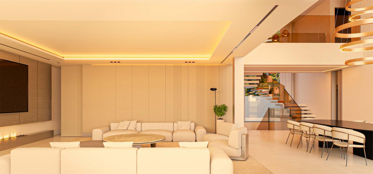 The ground floor welcomes you through a striking entrance hall, where the elevator connecting all levels of the home is discreetly located. From here, you step into a spacious 80 m² living area, elegantly divided into two ambient lounges and seamlessly connected to a sleek, open-plan kitchen — perfect for entertaining or family living. Also on this level is a guest bedroom with a walk-in closet and en-suite bathroom, offering both privacy and comfort. The main living area opens onto a spectacular partially covered terrace, leading out to the meticulously designed exterior.