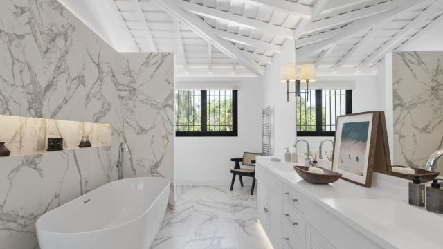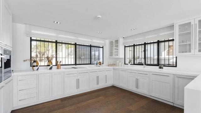 Frontline Golf Luxury Villa for sale in Nueva Andalucia Spain. Welcome to this luxurious family home located in the prestigious Nueva Andalucia area in Marbella. As you enter the property, you are greeted by a spacious open-plan living area that seamlessly blends indoor and outdoor living.