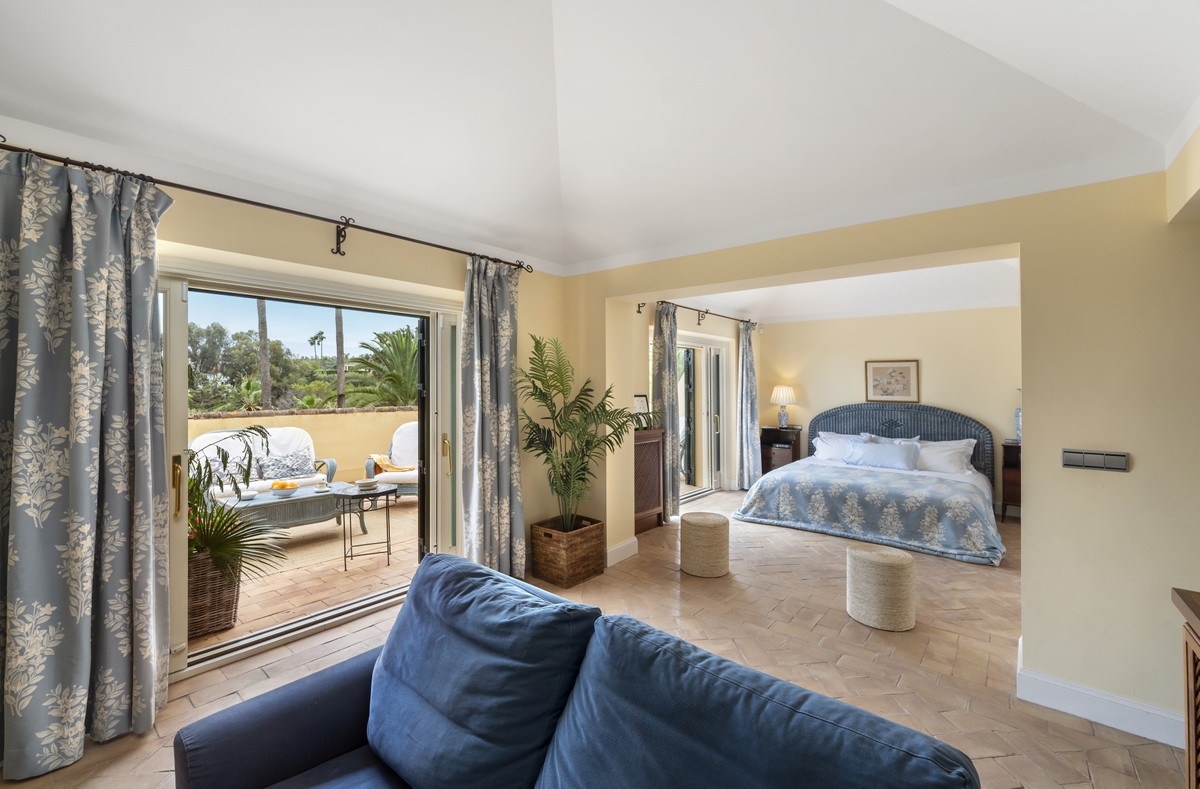 An elegant hallway leads to three additional bedrooms, each with its own en-suite bathroom. Two of these bedrooms have access to private terraces with stunning sea views and golf courses, while the central bedroom offers a living room with access to a large terrace.