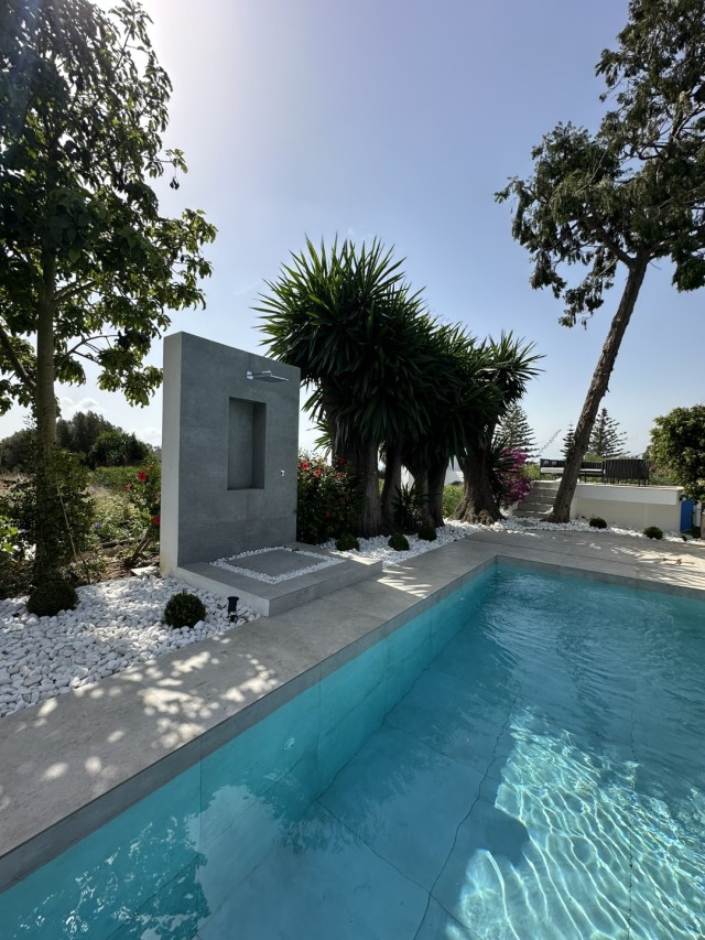 The villa’s expansive grounds are designed for outdoor living and entertaining. Adjacent to the guest house, you’ll find an outdoor kitchen, a toilet, and a changing room, all overlooking the paddle/tennis court and the lush, large garden. The pièce de résistance is the outdoor dining area, perfectly situated next to the impressive 14-meter long and 2.5-meter deep pool, ideal for al fresco dining and entertaining.