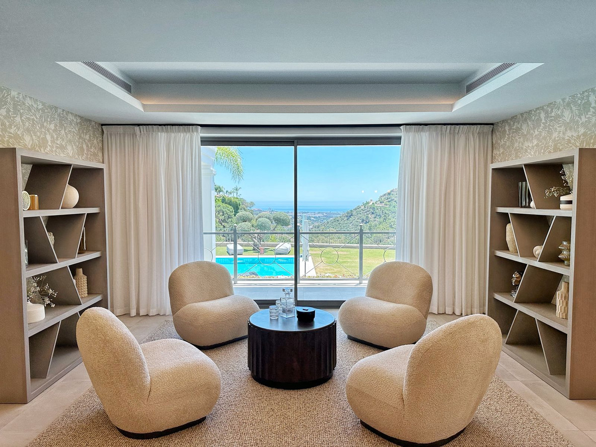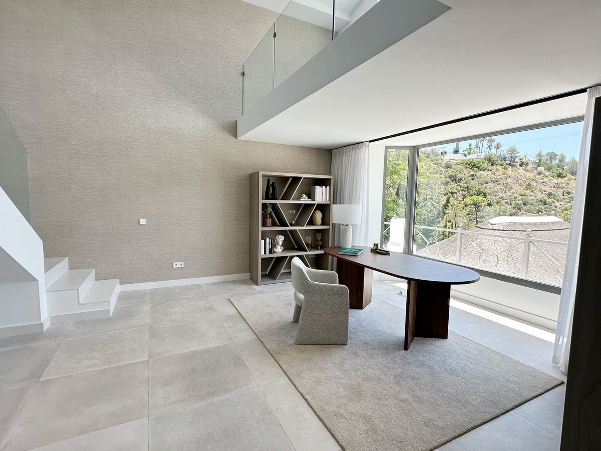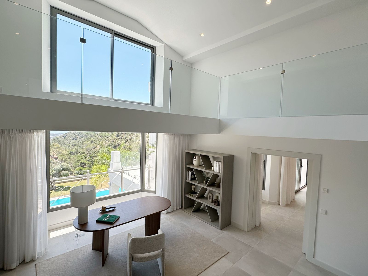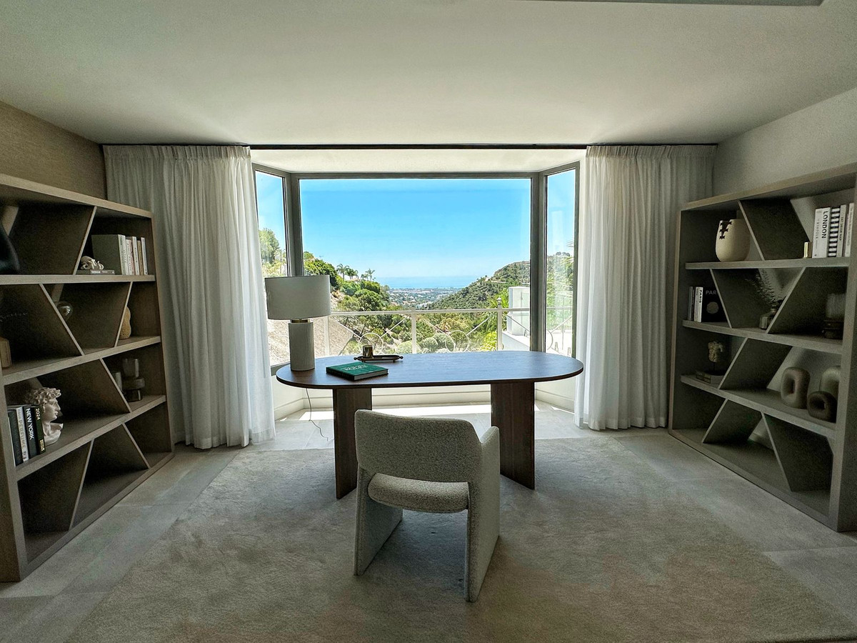 As you enter, you'll be greeted by a grand entrance hall leading to a spacious open-concept living room, an elegant dining area, and an oversized kitchen. Additionally, a stunning double-height office space provides a perfect work environment, all while enjoying unobstructed views of the El Madroñal mountains and the Mediterranean Sea.