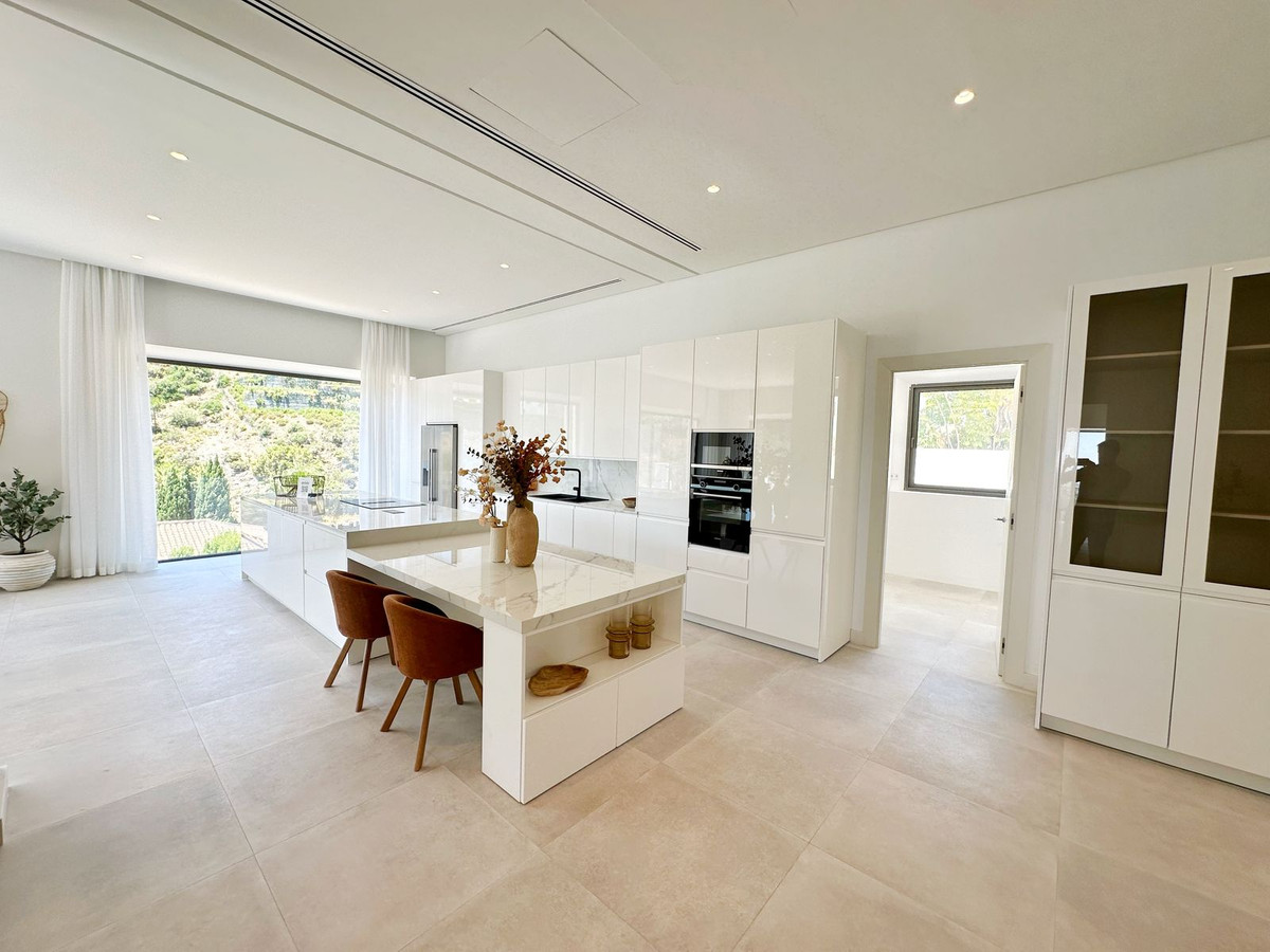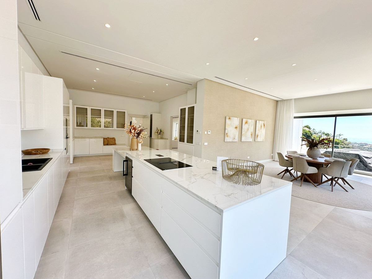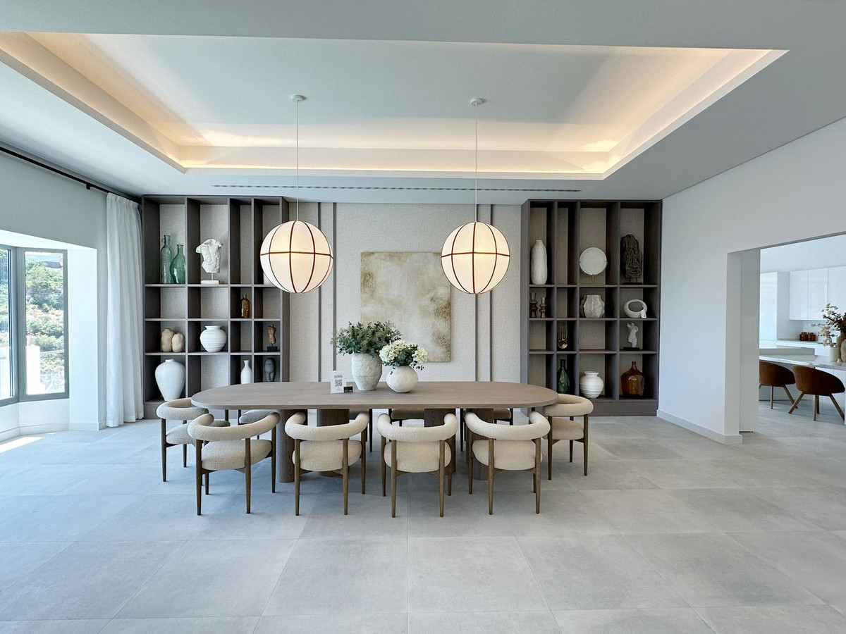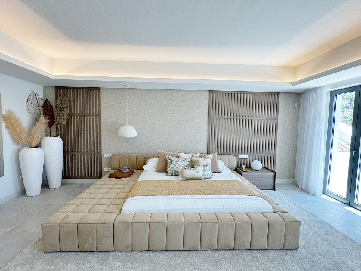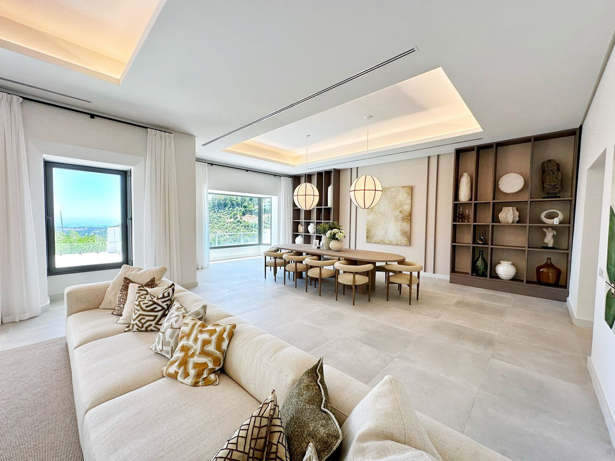 As you enter, you'll be greeted by a grand entrance hall leading to a spacious open-concept living room, an elegant dining area, and an oversized kitchen. Additionally, a stunning double-height office space provides a perfect work environment, all while enjoying unobstructed views of the El Madroñal mountains and the Mediterranean Sea.