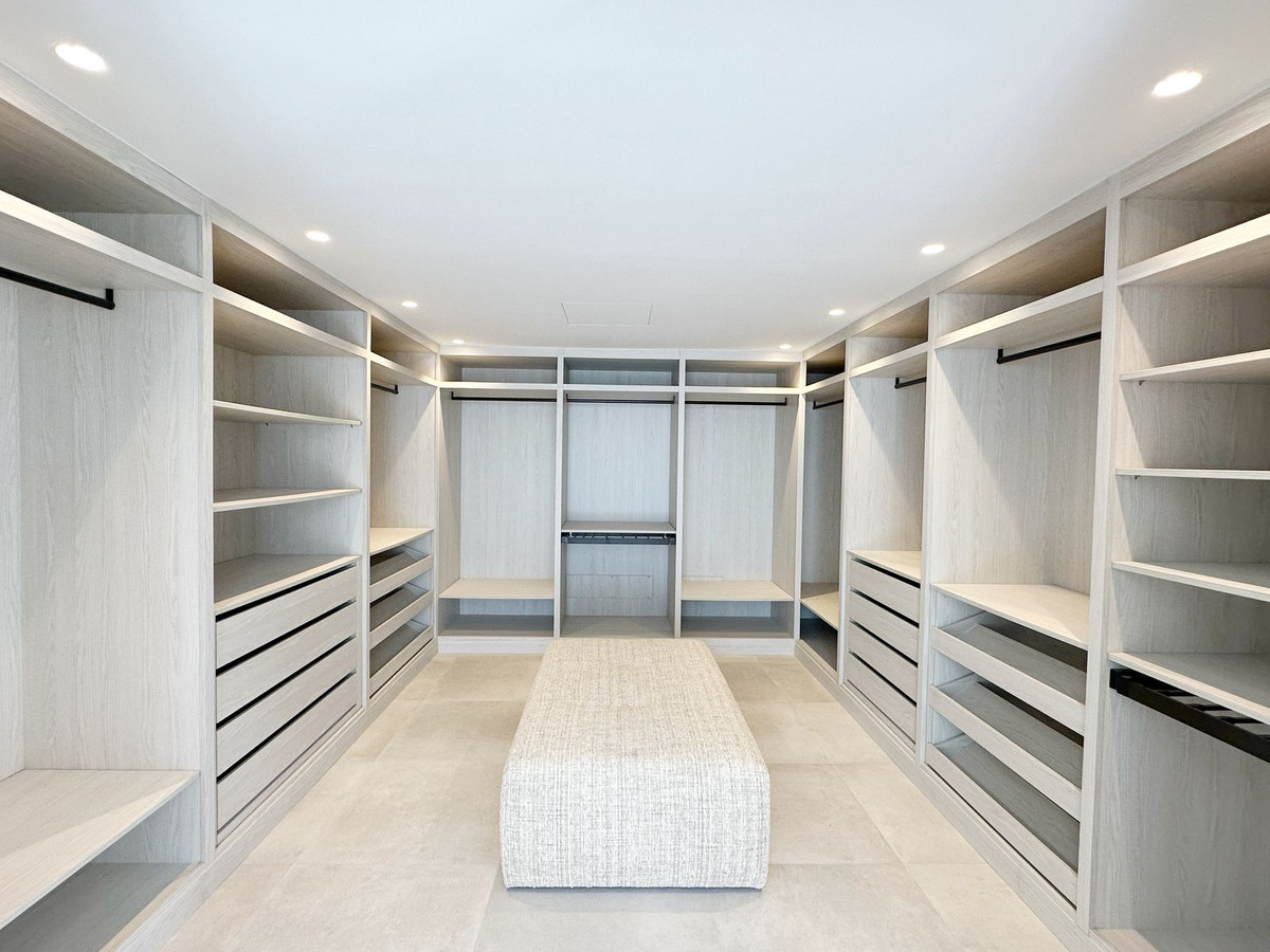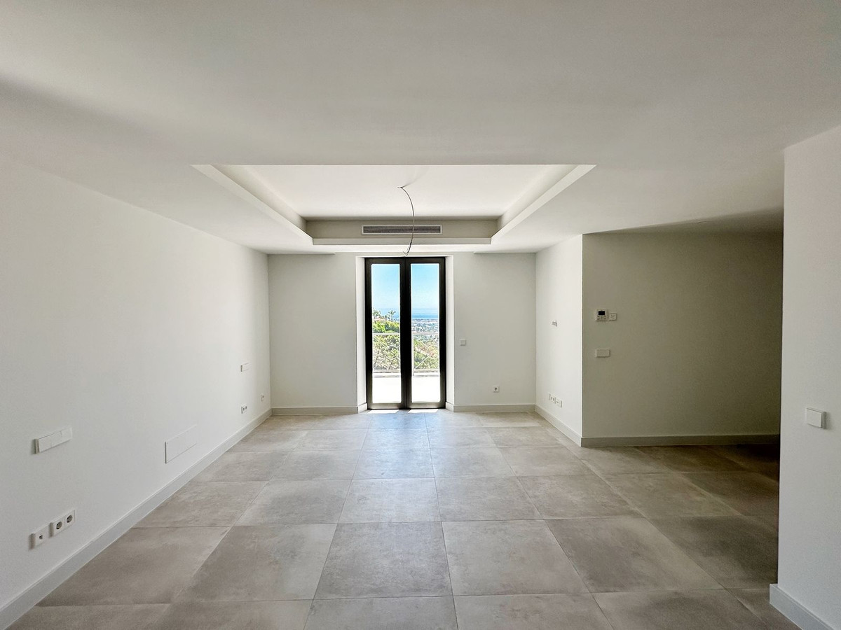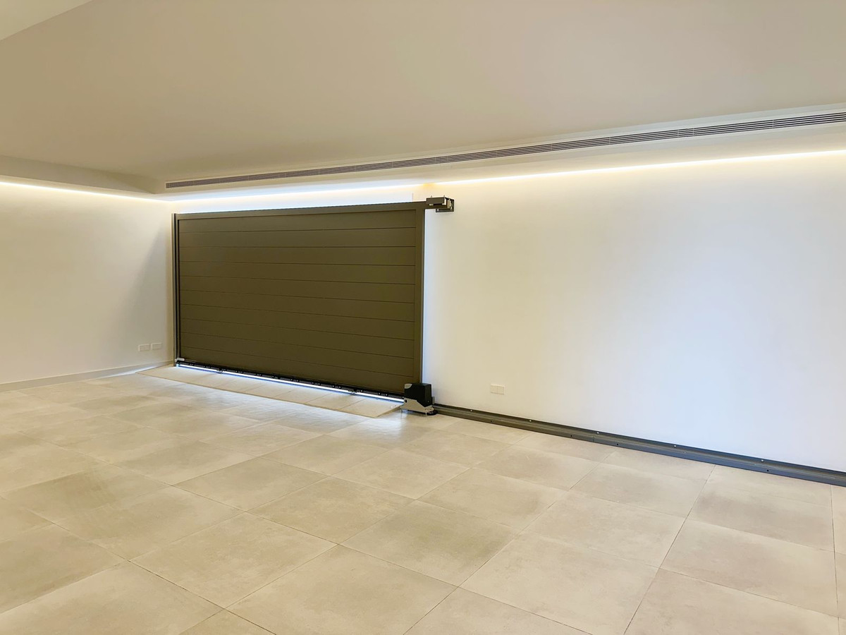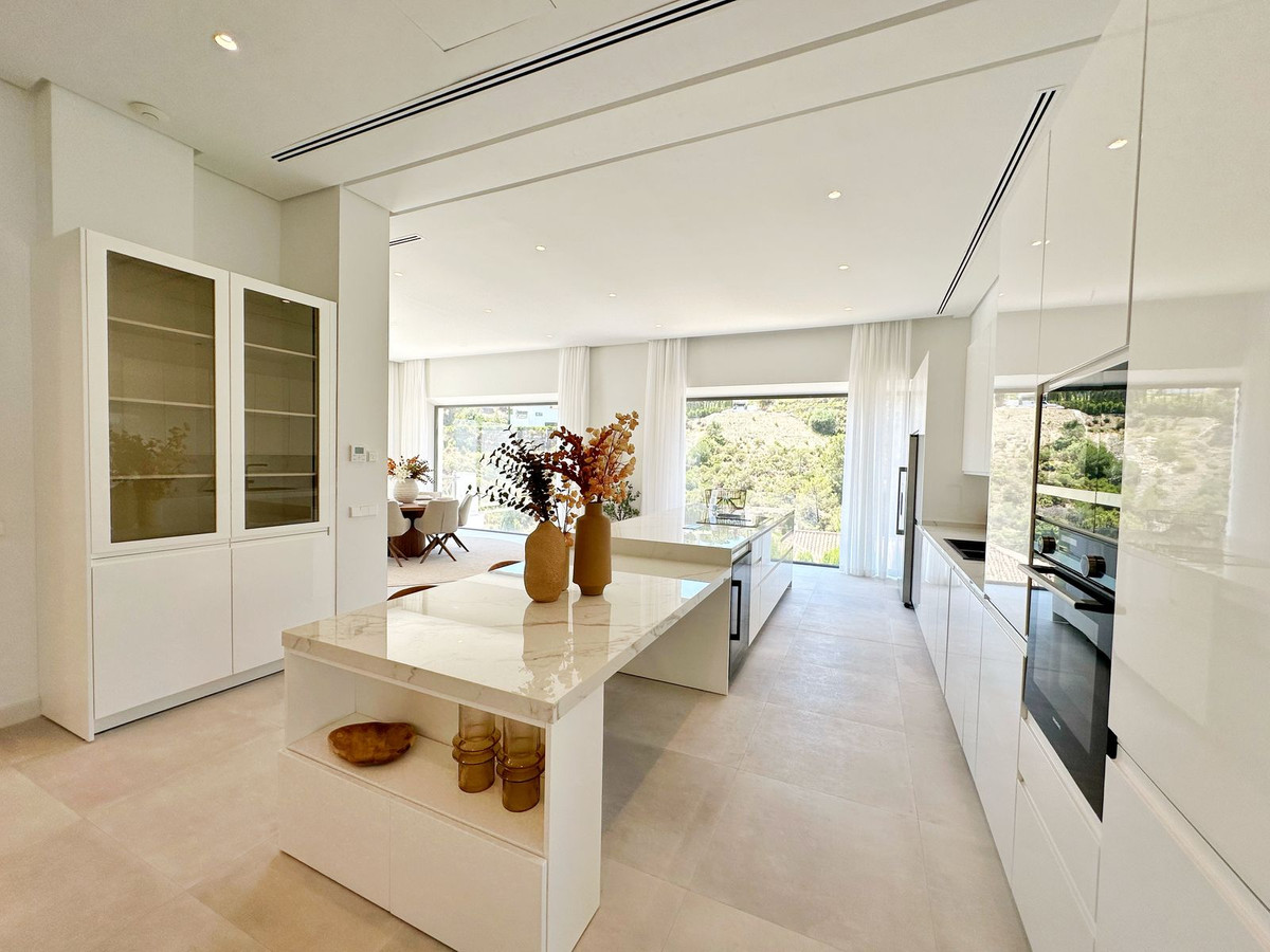 As you enter, you'll be greeted by a grand entrance hall leading to a spacious open-concept living room, an elegant dining area, and an oversized kitchen. Additionally, a stunning double-height office space provides a perfect work environment, all while enjoying unobstructed views of the El Madroñal mountains and the Mediterranean Sea.