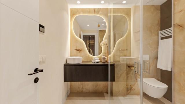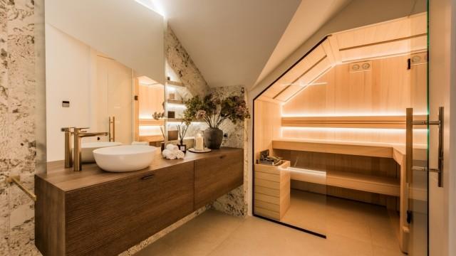 The open-plan concept features a fully equipped kitchen and a bright open dining area. The penthouse is equipped with many luxurious extras such as an electric fireplace, a Bang & Olufsen sound system, or tailormade wardrobes.