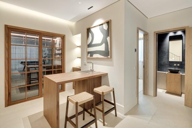 Step inside to discover an open-plan kitchen, dining and living room that seamlessly flows, offering an effortless indoor/outdoor living experience. The ground floor grants direct terrace access, enhanced by security glass windows with sun control. The living room’s soothing interior design is complemented by indirect LED lighting in ceiling coves and accent lighting spots, with a standing ethanol fireplace adding a touch of warmth and sophistication. The kitchen, practical yet aesthetically pleasing, features state-of-the-art AEG appliances and Silestone countertops, while the dining area offers direct views of La Concha mountain and access to the outdoor dining space and kitchenette.