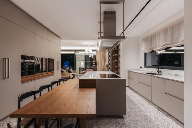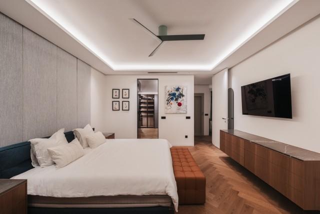 The three floors are connected by a lift, adding unparalleled comfort and convenience. The interior comprises a luxurious master bedroom with en-suite bathroom and dressing room on the first floor, along with two further bedrooms with en-suite bathrooms, all with panoramic sea views from the spacious terrace.