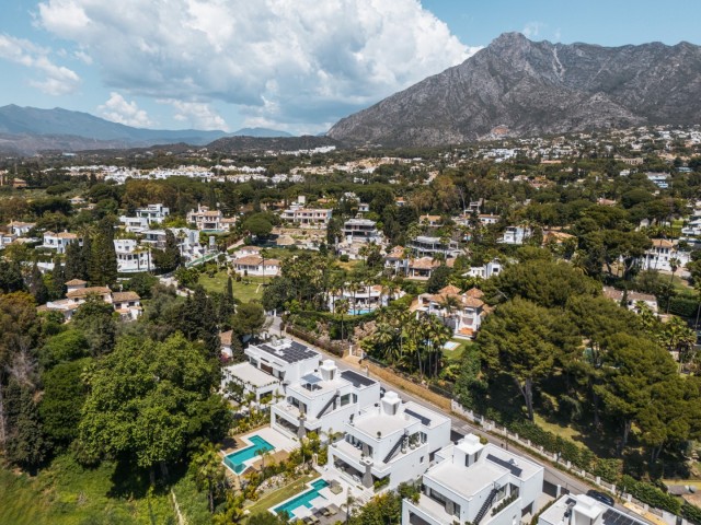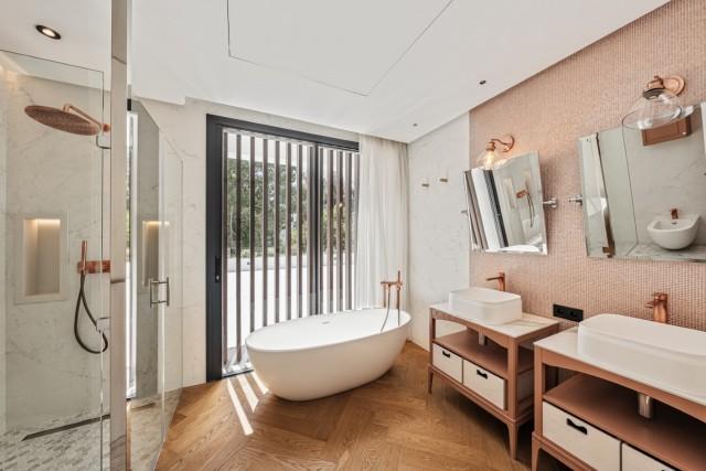 Splendid New Modern Villa for sale in Marbella Golden Mile. Discover this stunning brand new modern villa on a 1007m2 plot and situated in a prime location in Marbella. It has 5 bedrooms and 5 bathrooms. The 266m² terraces offer unique views surrounded by lush greenery and provide a mix of luxury and environmental awareness.