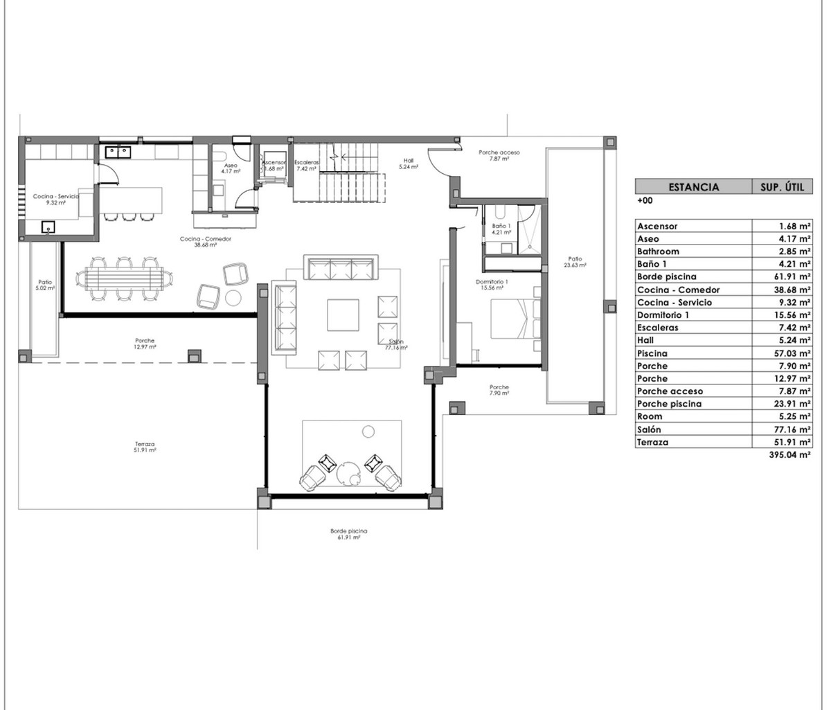 The ground floor is designed over 395m2, this size includes the pool and the terraces, and comprises of a large open plan living area of 77m2 with double height ceiling and huge floor to ceiling windows. Impressive architecture which frames the lovely pool and garden area outside.