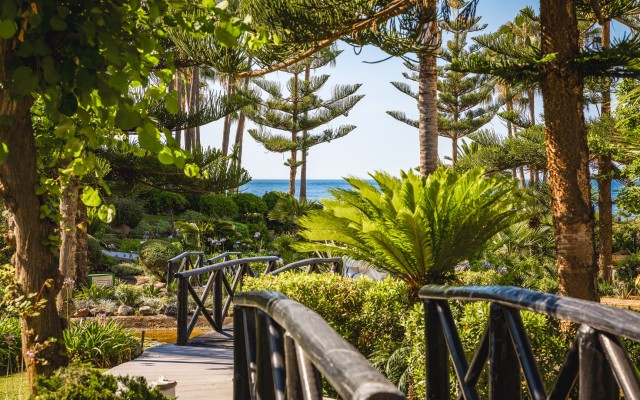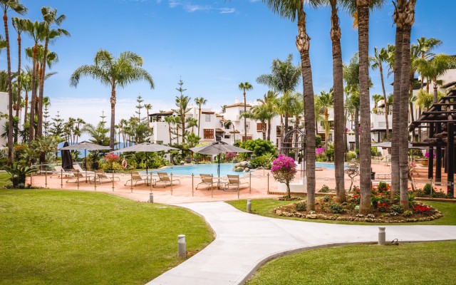 Fully Renovated Southwest-Facing Apartment In Marbella Beachfront Golden Mile Complex: Japanese Gardens in Puente Romano. This fully renovated southwest-facing apartment is located in the prestigious Japanese Gardens complex in Puente Romano. This elevated luxury apartment, all in one level, comprises: entrance hall; living/dining room with access to a partly covered terrace, overlooking the mature gardens and swimming pool; contemporary open-plan kitchen with centre island and access to the terrace; en-suite master bedroom; 2 additional bedrooms with 2 bathrooms, one of them en-suite. It includes a parking space and storage in the underground level.