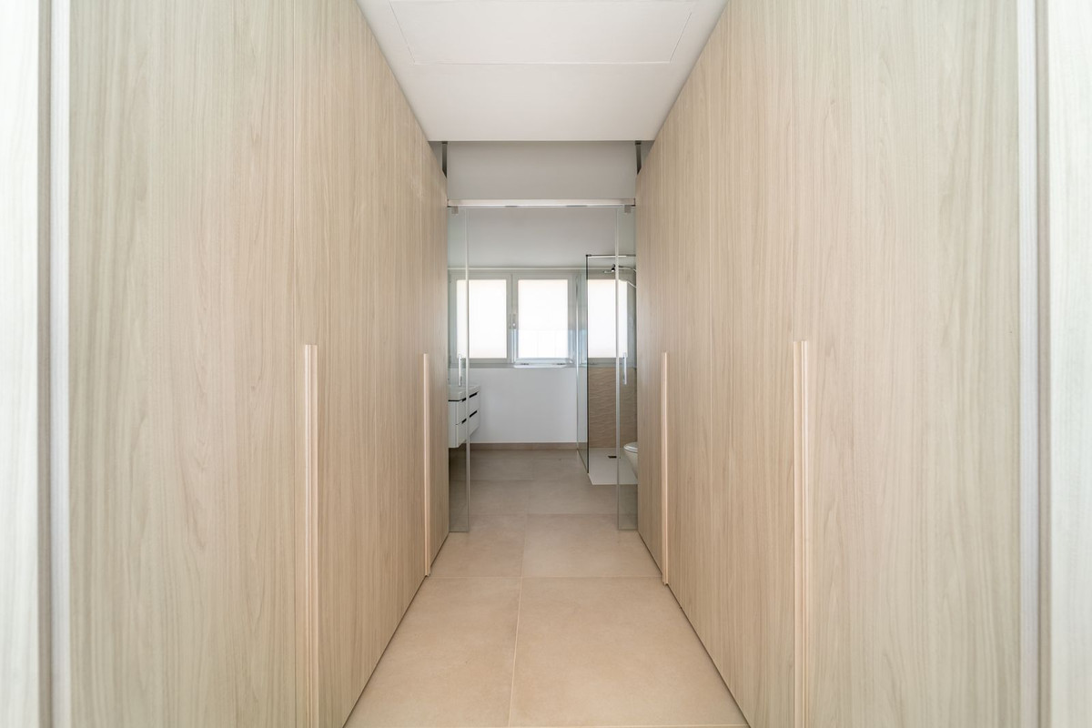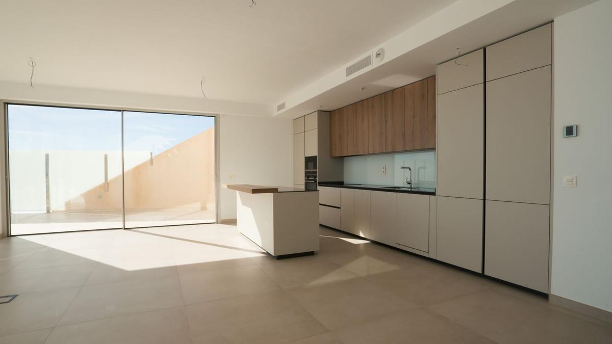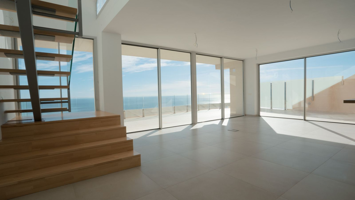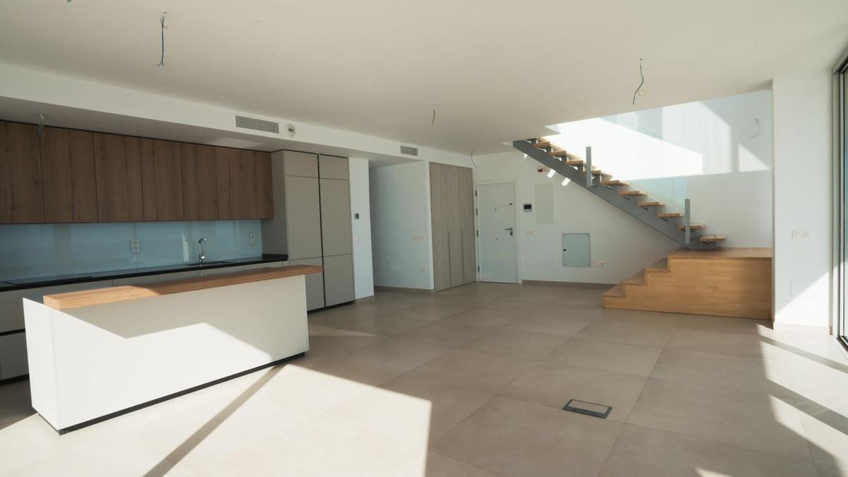 Brand new south facing penthouse duplex, located in the exclusive urbanization of Stupa Hills. The property consists of hall, 3 bedrooms with built-in wardrobes and electric blinds, bathroom and guest toilet, open plan kitchen fully furnished and equipped with electricial appliances from Siemens. Spacious living-dining room that leads out to a terrace of 65m2 with panoramic sea views, the Fuengirola Bay and of the Buddist Temple. On the top floor is located the main bedroom with walk-in closet, ensuite bathroom and laundry area. The bedroom leads out to a terrace of 21m2 with panoramic sea views. Air conditioning hot and cold with Airzone, video intercom, domotic system, pre-installation alarm system. Includes two parking spaces and one storage room.