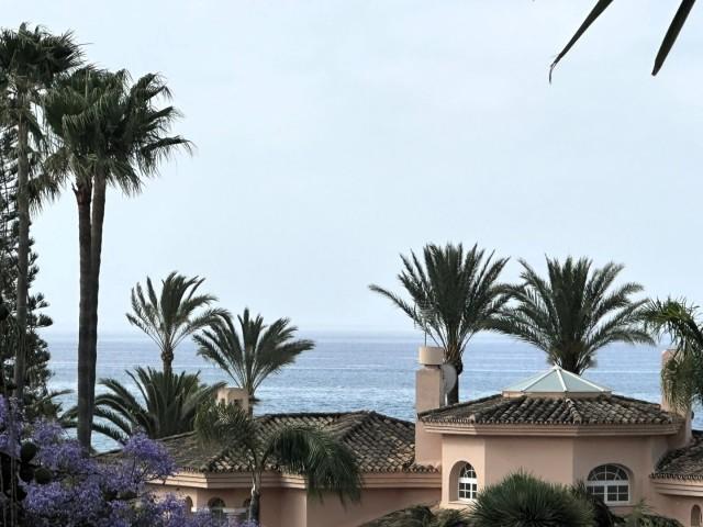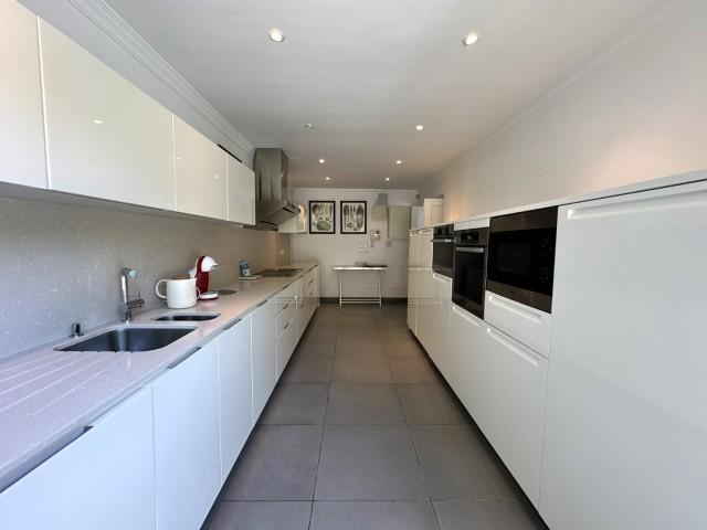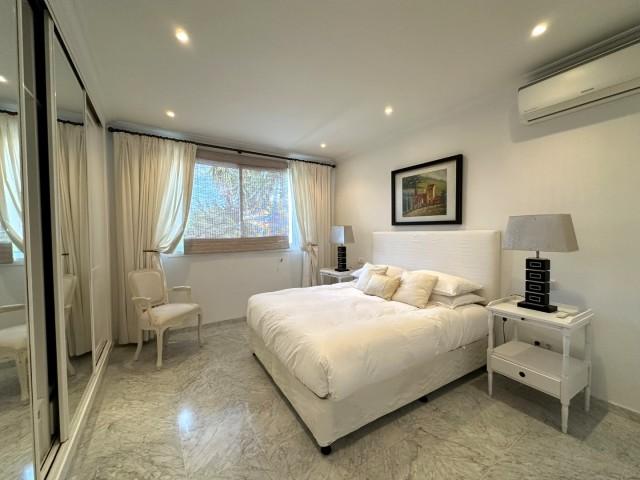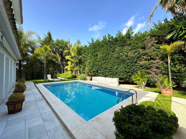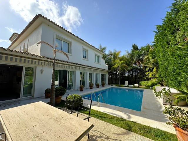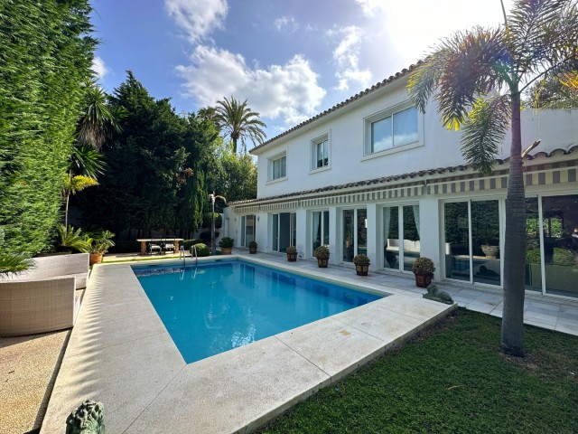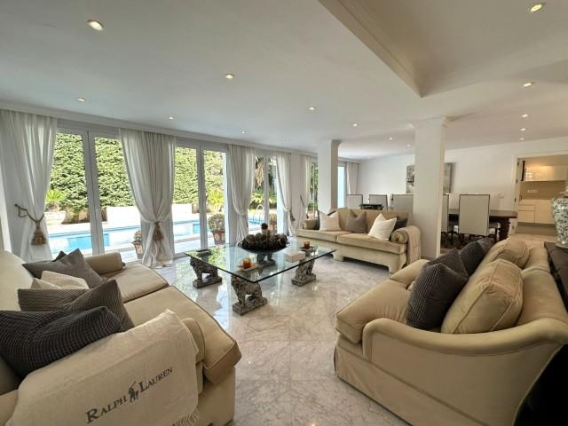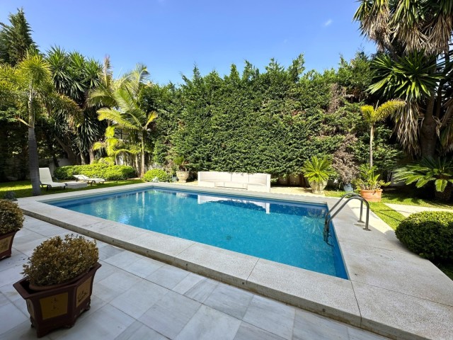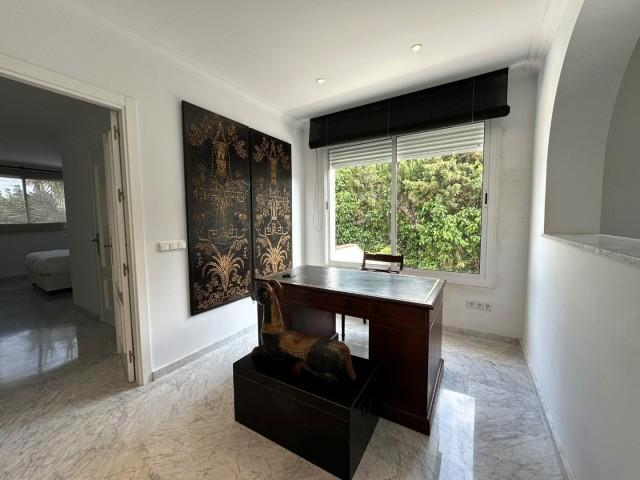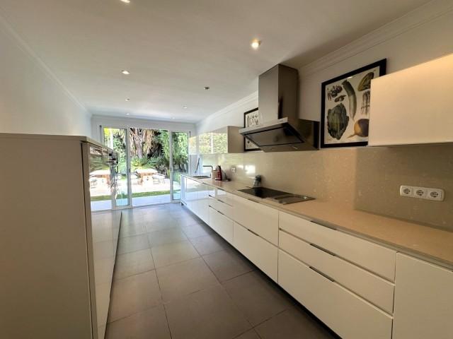 Spacious Beachside Villa in gated complex for sale in Marbella East. Lovely Mediterranean home, located in a beautiful community and just a short stroll to a sandy beach. This charming villa, built on two levels, welcomes you as you enter with an open plan entrance space with a guest toilet, which flows into the spacious dining-living room and library area with a gas fireplace and access to the exclusive garden with swimming pool. The kitchen is fully equipped with Gaggenau appliances, and has access to the garden and outdoor dining area.