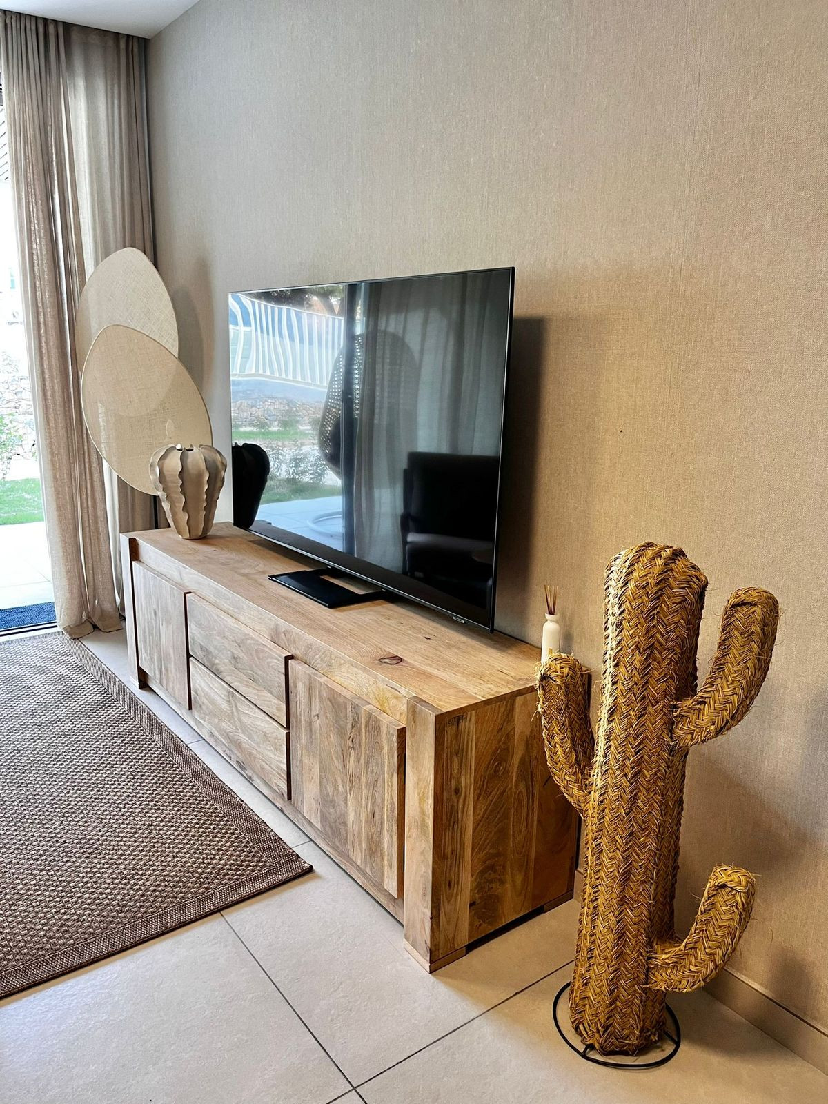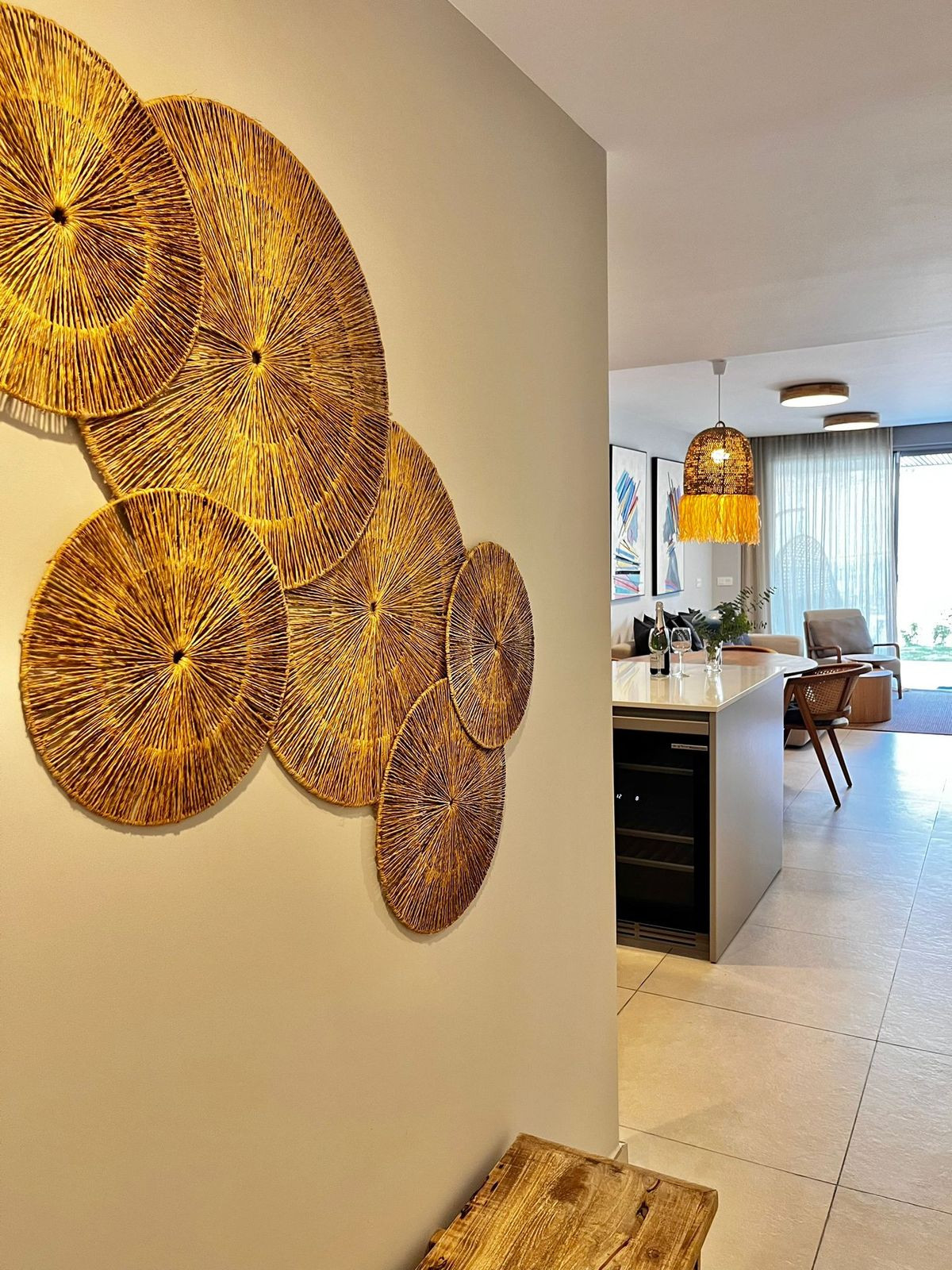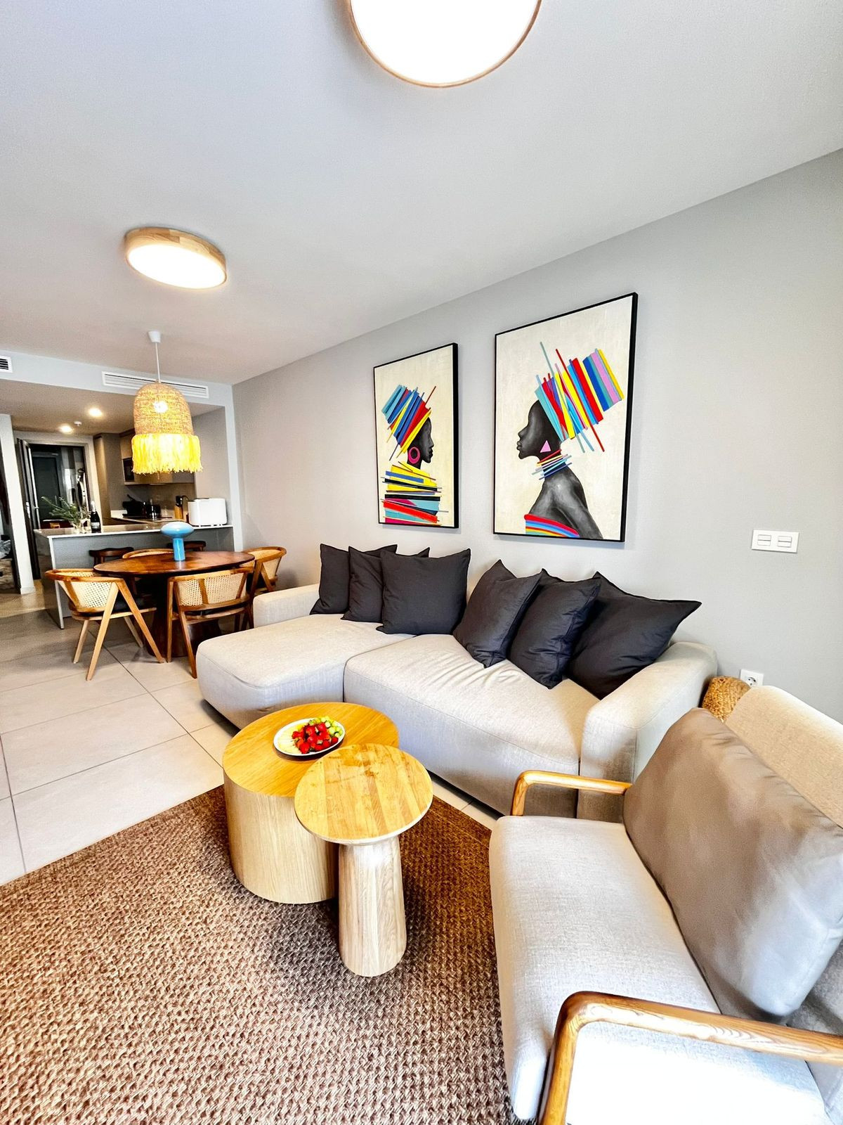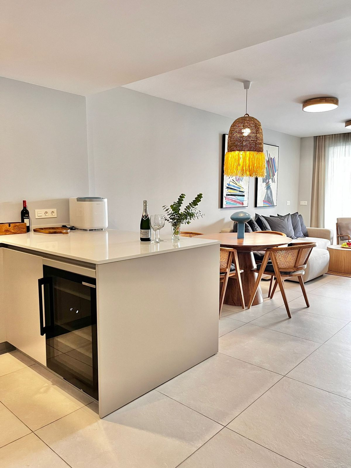 The apartment is equipped with a living room with access to the terrace and garden with a dining room and an open fully equipped kitchen and utility room, where there is a washing machine and dryer.