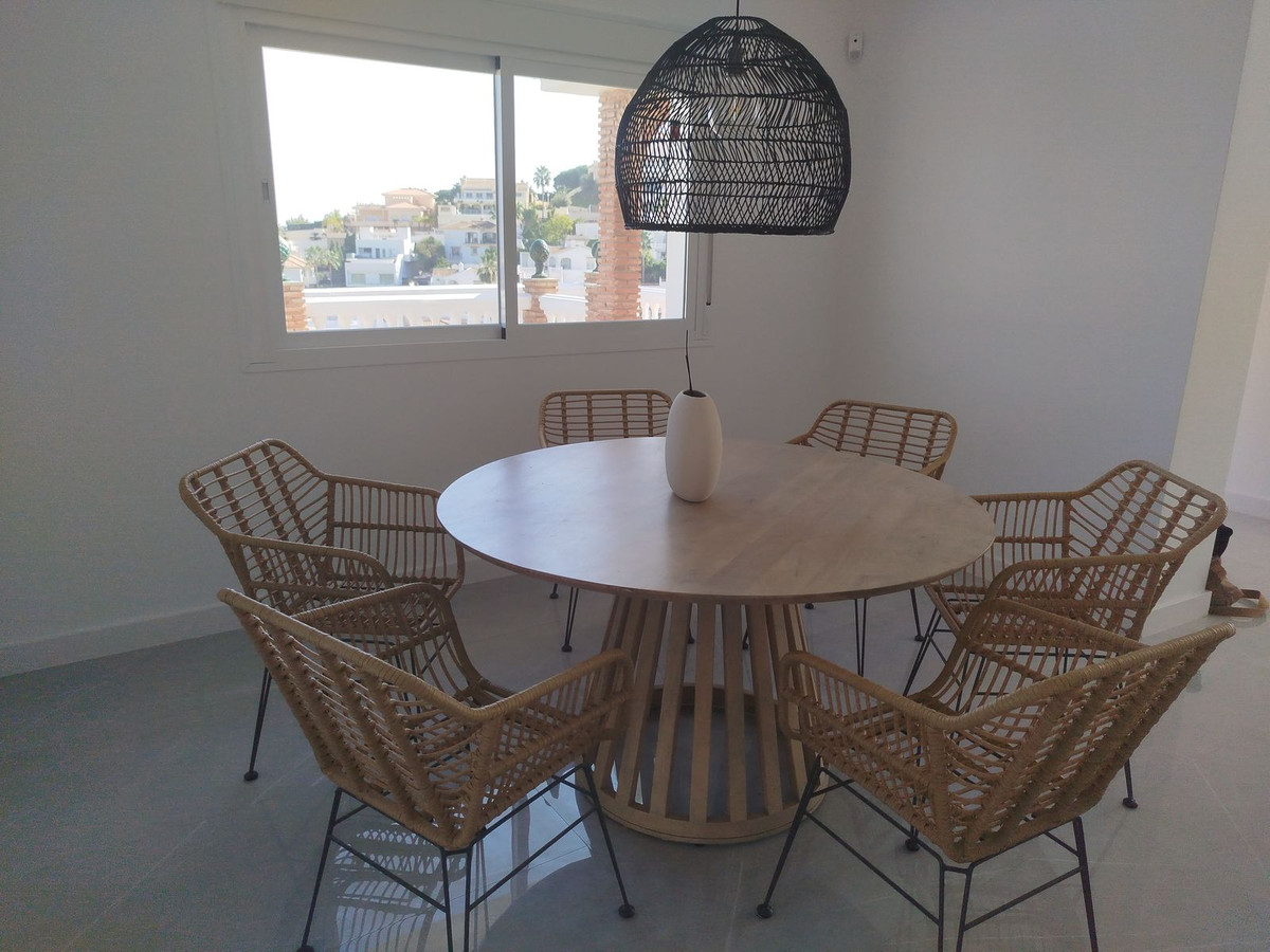 This immaculate 3-bedroom villa with 3 ensuite bathrooms has recently been totally renovated to a high standard. It is set in an elevated position in Cerros de Aguila with unparalled panoramic sea and mountain views. You enter via a long driveway with private parking plus a covered garage for 2 cars and with a good-sized storeroom. There is a gated entrance to the one level villa with an open plan living/dining room and kitchen diner both with access to large terraces with panoramic sea views and to the landscaped gardens with an infinity pool. There are 2 guest bedrooms with ensuites with access to the back garden and terraces, a guest toilet, and a large master bedroom with a feature bath, washbasin and toilet with panoramic views to the sea. The property has underfloor heating in most rooms with electric blinds and hot and cold air conditioning. The property is all fenced and alarmed with terraced gardens with a selection of fruit and palm trees. There is also a roof solarium with panoramic 360-degree views of the mountains and the sea. The property is within easy access to Fuengirola and Mijas, bars, restaurants, beach and the new Mijas park. You also have the well-placed community pool, gardens, sport facilities, bars and shops of the local community of Cerros de Aguila.Property is set within easy access to cycle paths and horse ridings stables.