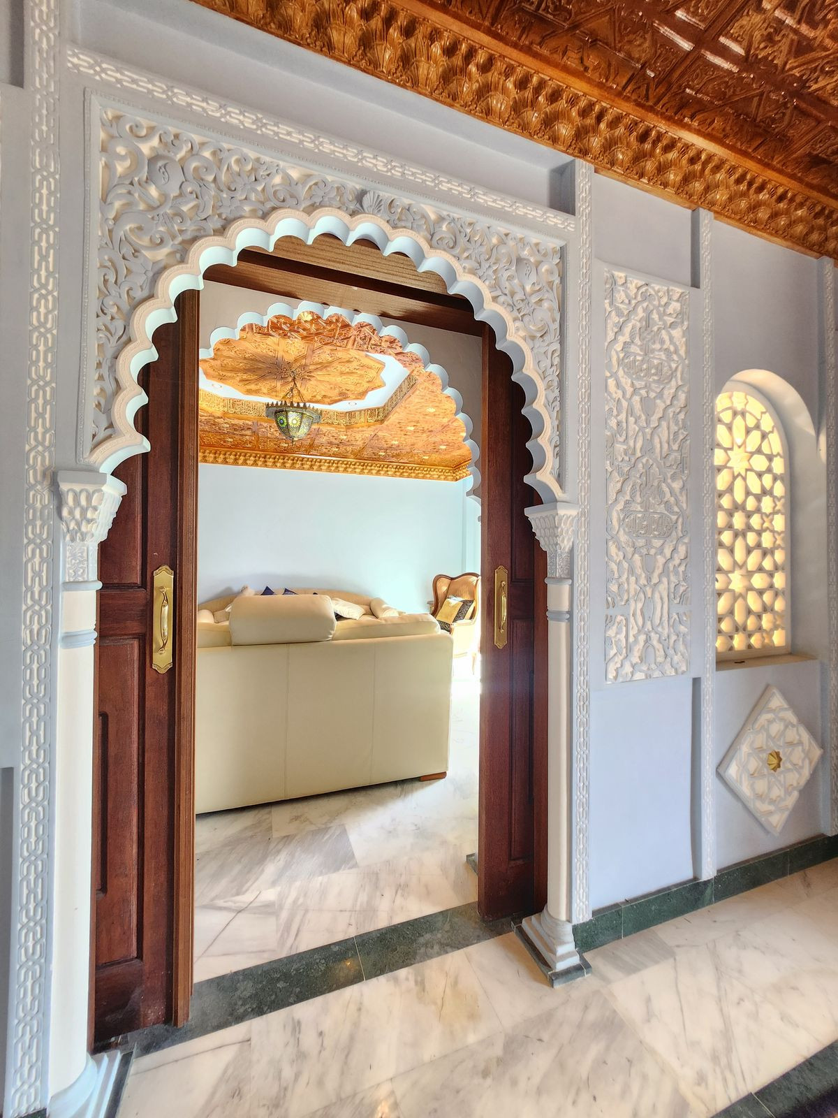 To the left, a sliding double door opens to a large, bright double living room with sea views and windows overlooking the side garden. The high ceiling is lined with hand-carved mahogany wood, adding an artisanal touch to the space. This floor also includes a bright bedroom with garden views and a marble bathroom, perfectly equipped.