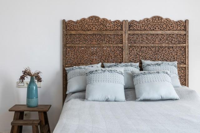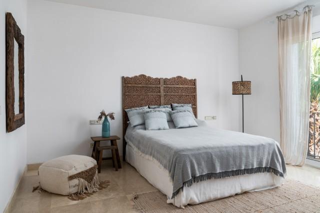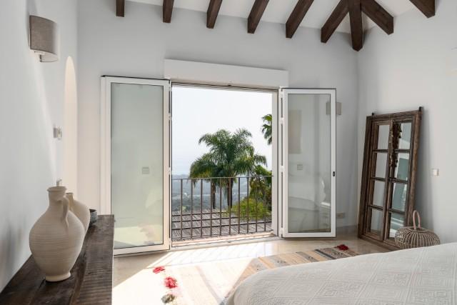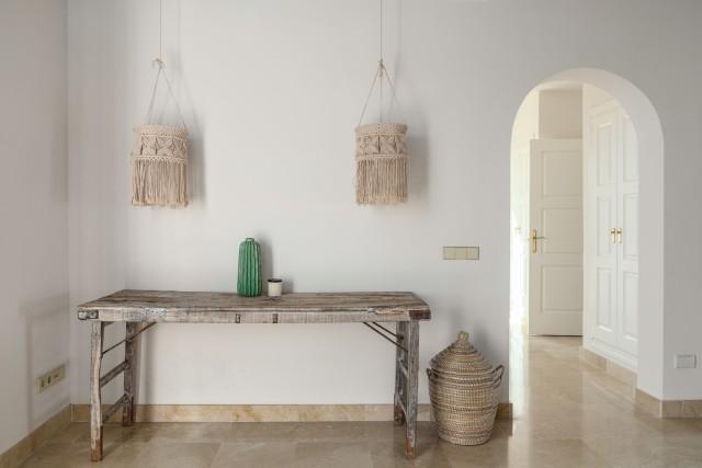 The ground floor houses two large double bedrooms to the left of the hall. On the other side, you’ll find a newly refurbished kitchen equipped with Gaggenau appliances, and both an indoor and outdoor dining area conveniently located to close proximity to the kitchen and facing the sea views. The villa’s interior balances traditional Andalusian style with a hint of bohemian flair.