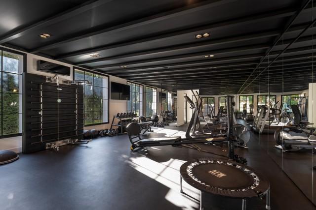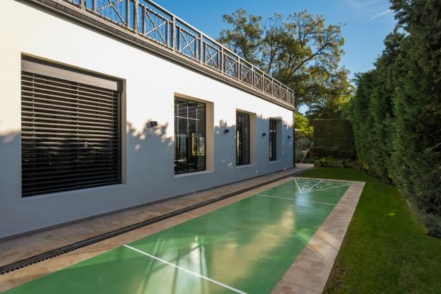 In addition to the main villa, a separate building hosts a fully equipped gym, a Turkish bath, a massage room, a complete bathroom, and storage space, offering a private wellness retreat. Outdoors, the property boasts a beautiful pool area surrounded by landscaped gardens, a BBQ area, a shuffleboard court, and spacious terraces designed for relaxation and entertainment.