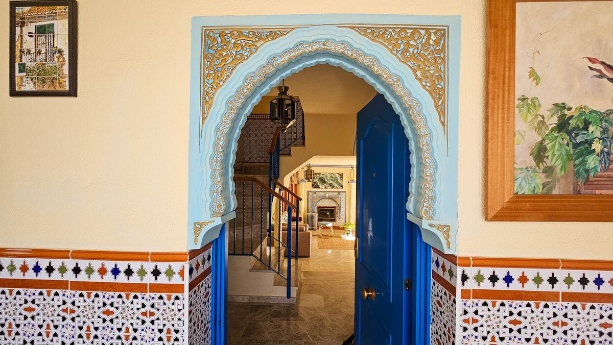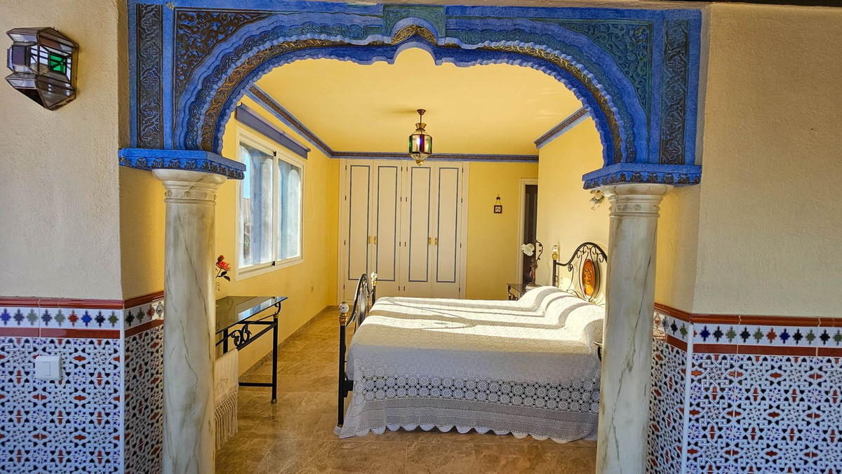 Beautiful 4 bedroom, 3 bathroom, 1 toilet corner townhouse with private exterior glazed terraces in Marina de Casares, close to the beautiful blue flag sandy beach and many shops, bars and restaurants. The property boasts the purest Andalusian style with marble floors, typical tiles and arabesque details. It is distributed over two levels with panoramic sea views. On the ground floor we find a spacious living room with fireplace, a guest toilet, a large independent kitchen with dining area and laundry area. And, most importantly, access to a huge outside terrace with a beautiful fountain. This beautiful outdoor space is walled, giving it a great feeling of privacy. The perfect place to spend the whole day and relax. There is a direct exit to the pool and common areas, very practical to go back and forth from the pool to the house throughout the day. On the upper floor we find 4 bedrooms and 3 full bathrooms. The master bedroom has an en-suite bathroom with jacuzzi, and a huge terrace with panoramic views of the sea and the beach. All bedrooms have fitted wardrobes and one of them also has its own terrace with side sea views. This small gated community has beautiful communal areas, gardens and swimming pool, whilst maintaining very reasonable community fees. In addition, it has outdoor parking areas and can be purchased furnished as an option.