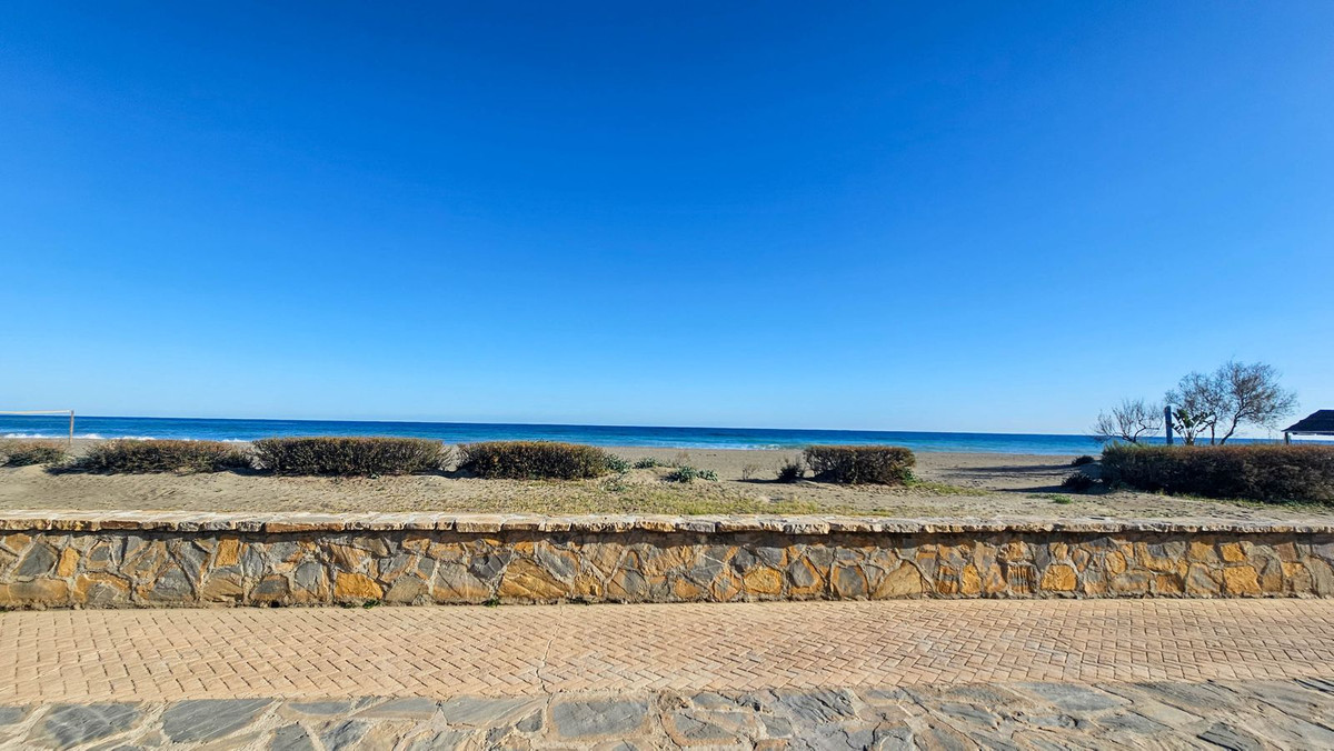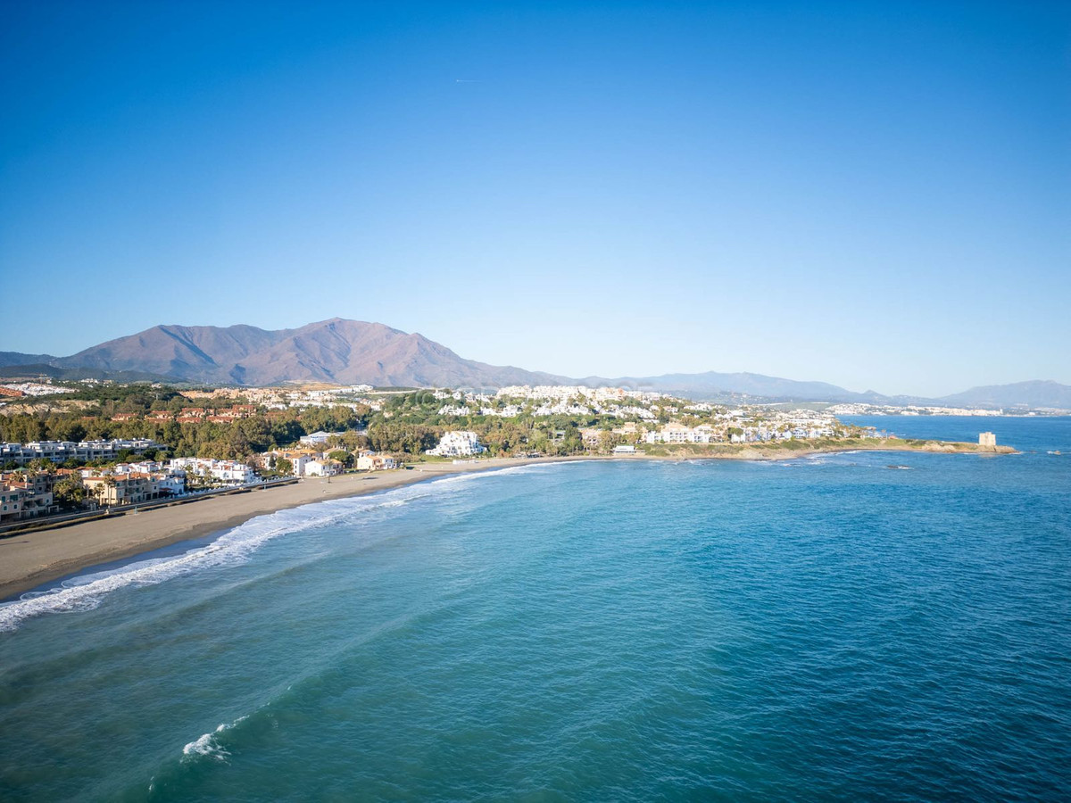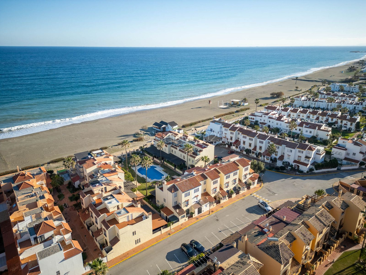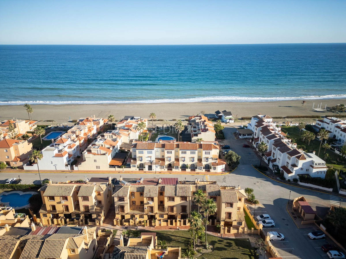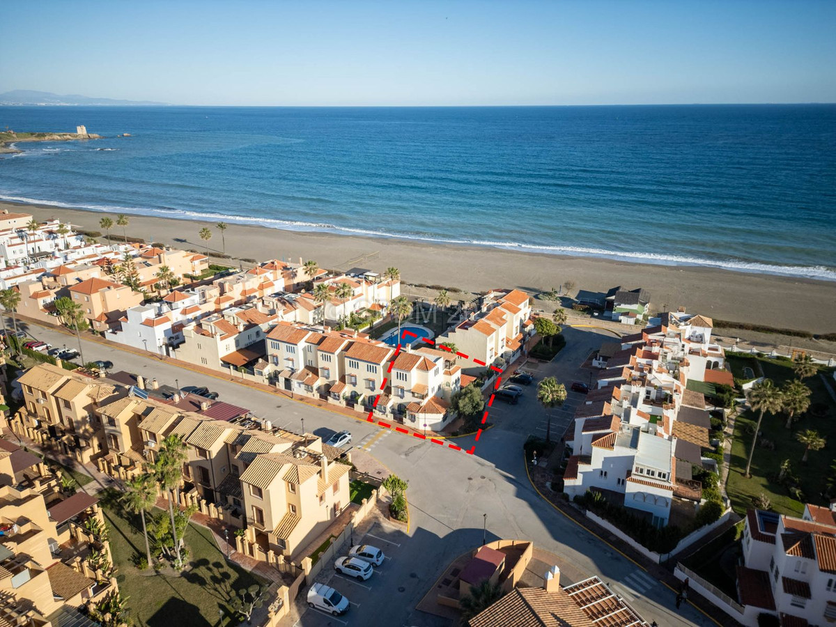 This magnificent property is located in a frontline beach development. It is ideally located in a quiet area and yet is just a few minutes from the town of Sabinillas with all its amenities. The semi-detached house is located in a well-maintained private and quiet development with beautiful gardens and communal pool. In addition to a public paddle tennis court complex right next door. The development is located in Marina de Casares, between Sabinillas and Estepona, with easy access to the motorway, 5 minutes drive from both towns and the attractive Puerto de la Duquesa where there are all kinds of shops and leisure venues. Very close to 3 different beaches with good restaurants and a wonderful beach club, one of them a dog beach, and very close to the new Estepona Hospital. There are 5 golf courses within a 5-minute drive, one of them being the well-known Finca Cortesin, of great prestige and home to the Volvo Masters for some years.