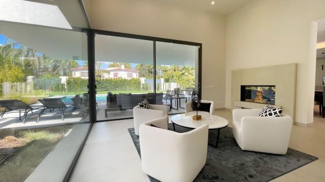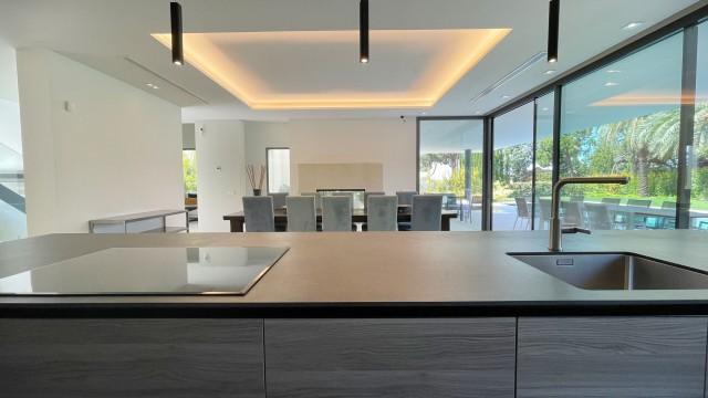Spectacular modern villa for sale in the heart of Marbella's Golden Mile. It comprises of 5 bedrooms and 5.5 bathrooms, spread over 3 levels with an elegant elevator. It includes a basement where you'll find a spacious garage, a gym area, and a home cinema room.