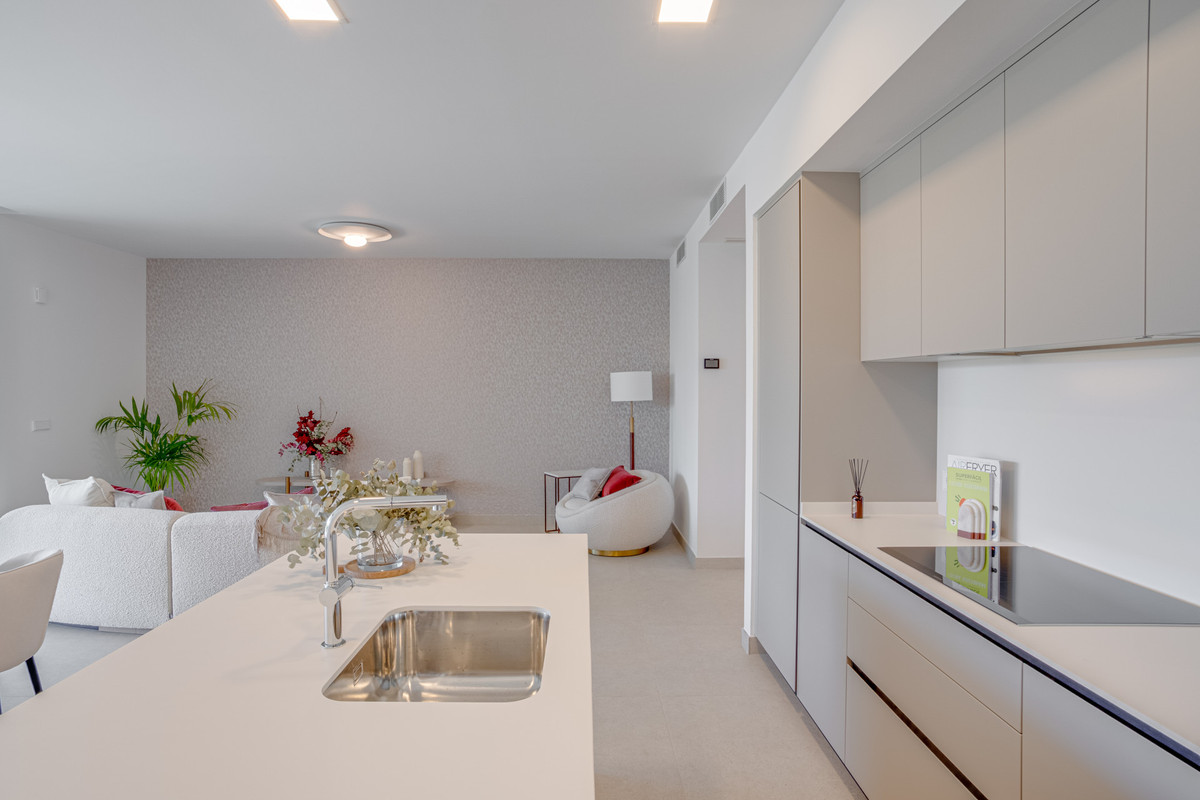 Stunning south-facing ground-floor apartment located in the exclusive Marbella Sunset residential complex in Cabopino. This contemporary home combines modern design with comfort and elegance, featuring a spacious private terrace ideal for relaxing or enjoying outdoor dining under the Mediterranean sunshine.The property offers three bedrooms and three bathrooms. The fully equipped kitchen is finished with high-quality materials and designed for both style and functionality. The bright and spacious living-dining area connects seamlessly with the terrace and outdoor space, creating an inviting indoor–outdoor living experience. Additional features include hot and cold air conditioning and two private parking spaces. The residential complex boasts beautifully landscaped gardens and swimming pools, providing an exclusive and tranquil atmosphere. The area also offers a great selection of nearby amenities, including restaurants, schools, the beach, and golf courses, making this property an ideal option for both permanent living and as a second home.