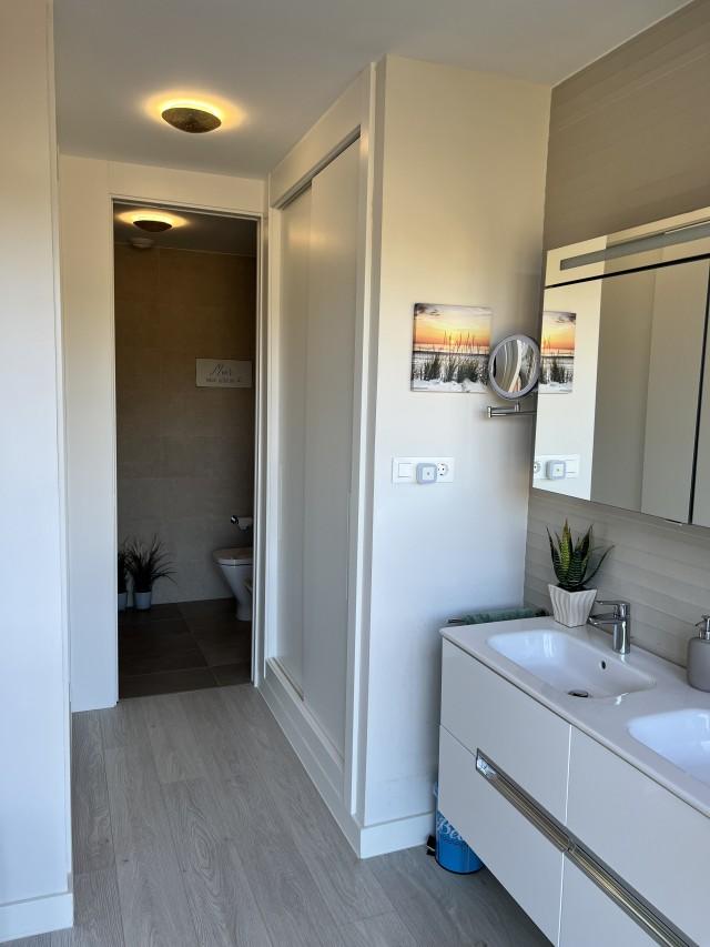 The ground floor boasts a bright and airy living room that opens up to a large west-facing terrace and private garden, perfect for outdoor gatherings, with stunning views of the golf course. The sleek, modern kitchen is fully equipped with high-end appliances. Also on this level, you’ll find a convenient guest WC and a useful storage room. Upstairs, the master bedroom comes with an en-suite bathroom and a private glazed terrace overlooking the golf course. Two additional well-sized bedrooms share a bathroom and have access to a balcony.