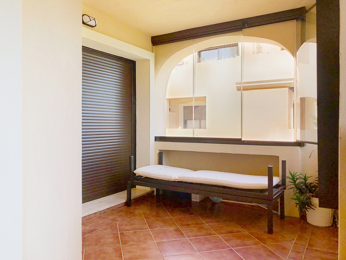 The interior of the property features a spacious and bright main living room with direct access to a large private terrace enclosed with Lumon glass, perfect for enjoying the outdoors and golf views both in summer and winter. The kitchen has been completely renovated with high-quality furniture, fully equipped, and designed to maximize functionality, including a separate laundry area. Marble floors and glass doors add a modern and elegant touch to the space.
