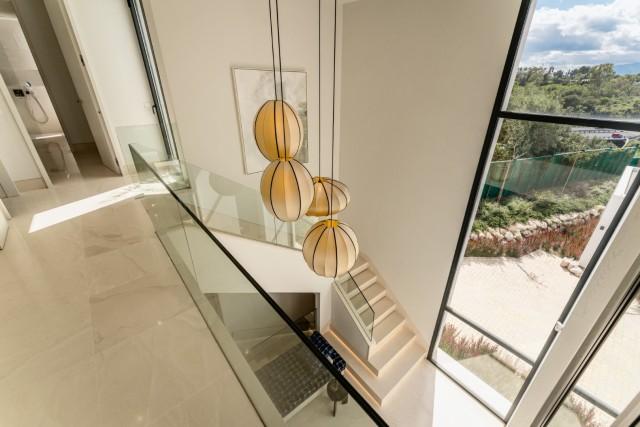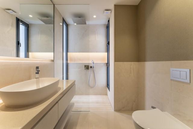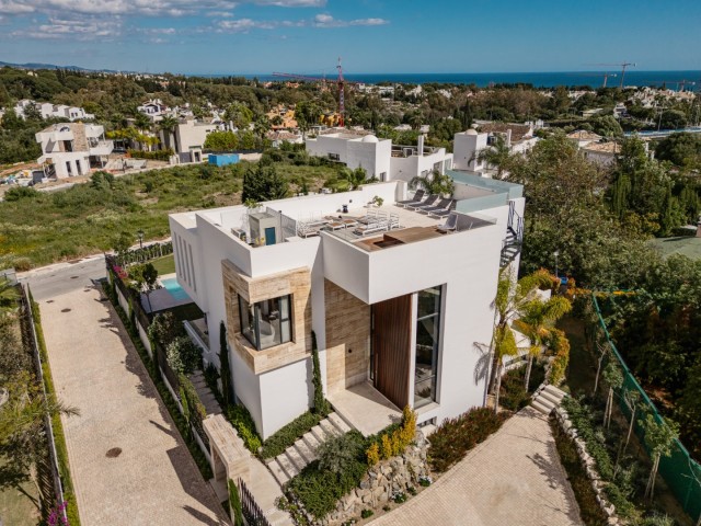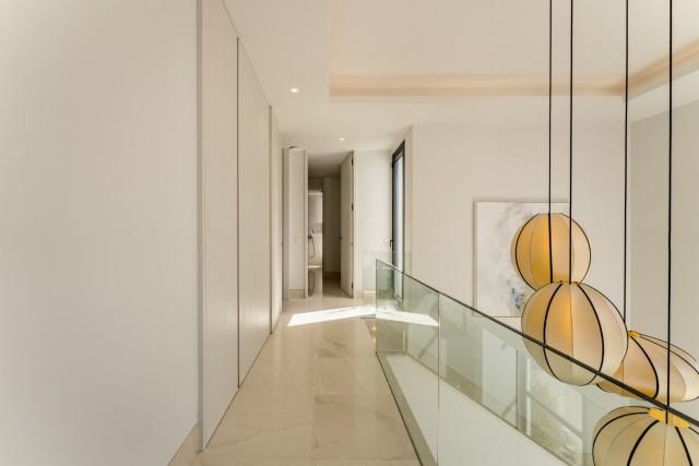 The first floor hosts the master suite, which includes a luxurious bathroom and a well-appointed dressing room. Two additional bedrooms on this level also enjoy terrace access, offering picturesque views of the surrounding landscape. The rooftop terrace is a standout feature, designed for ultimate enjoyment with a jacuzzi, and breathtaking views of Marbella’s coastline and mountains, making it ideal for entertaining or unwinding in style.