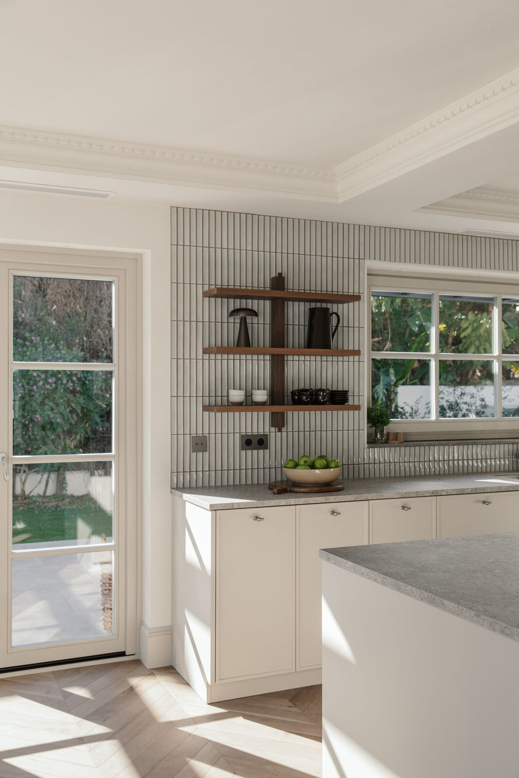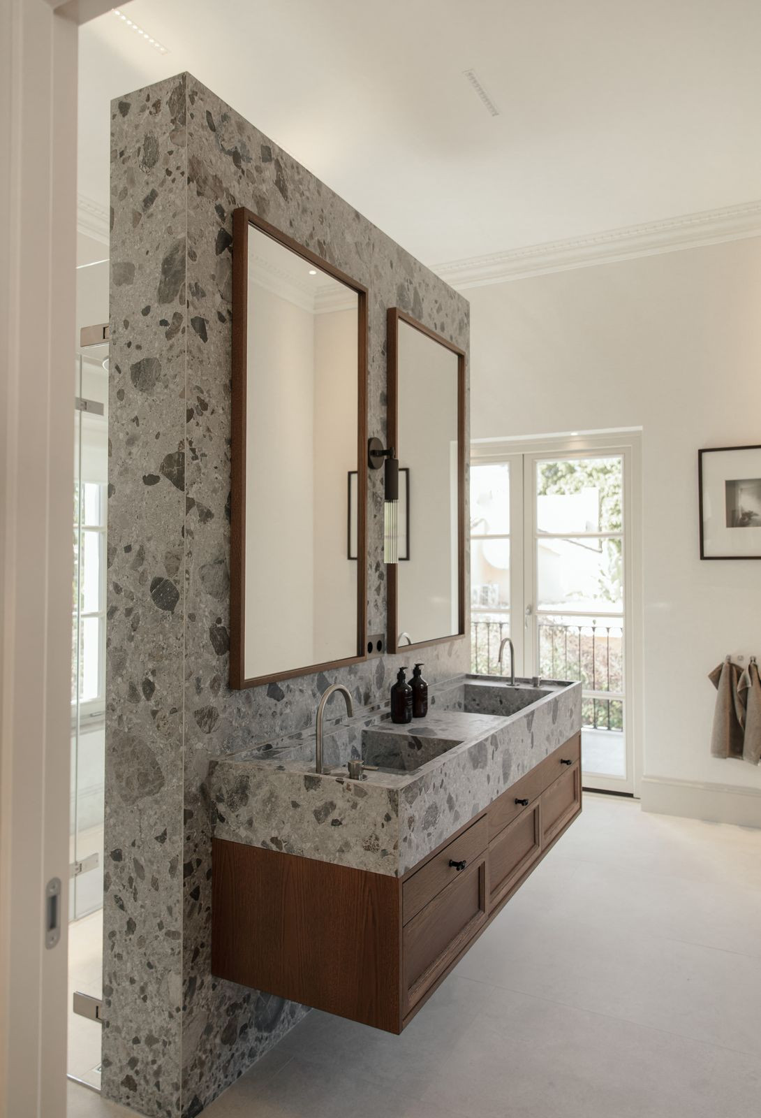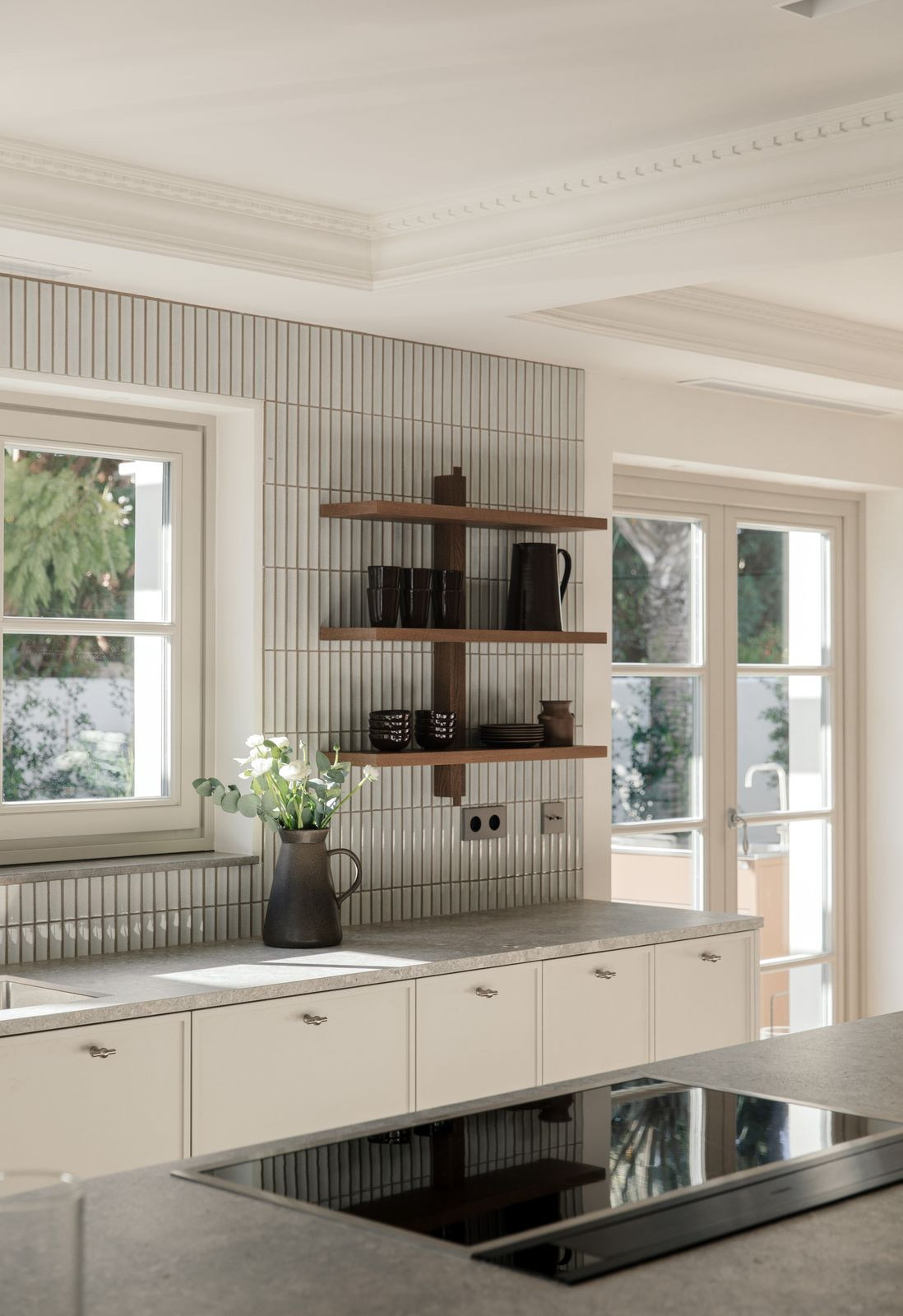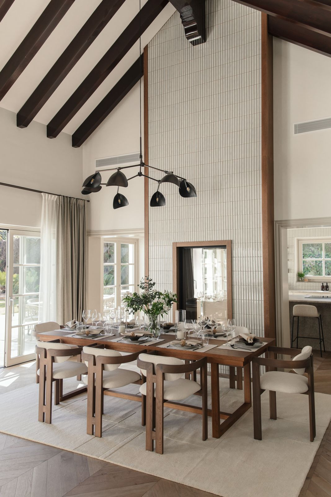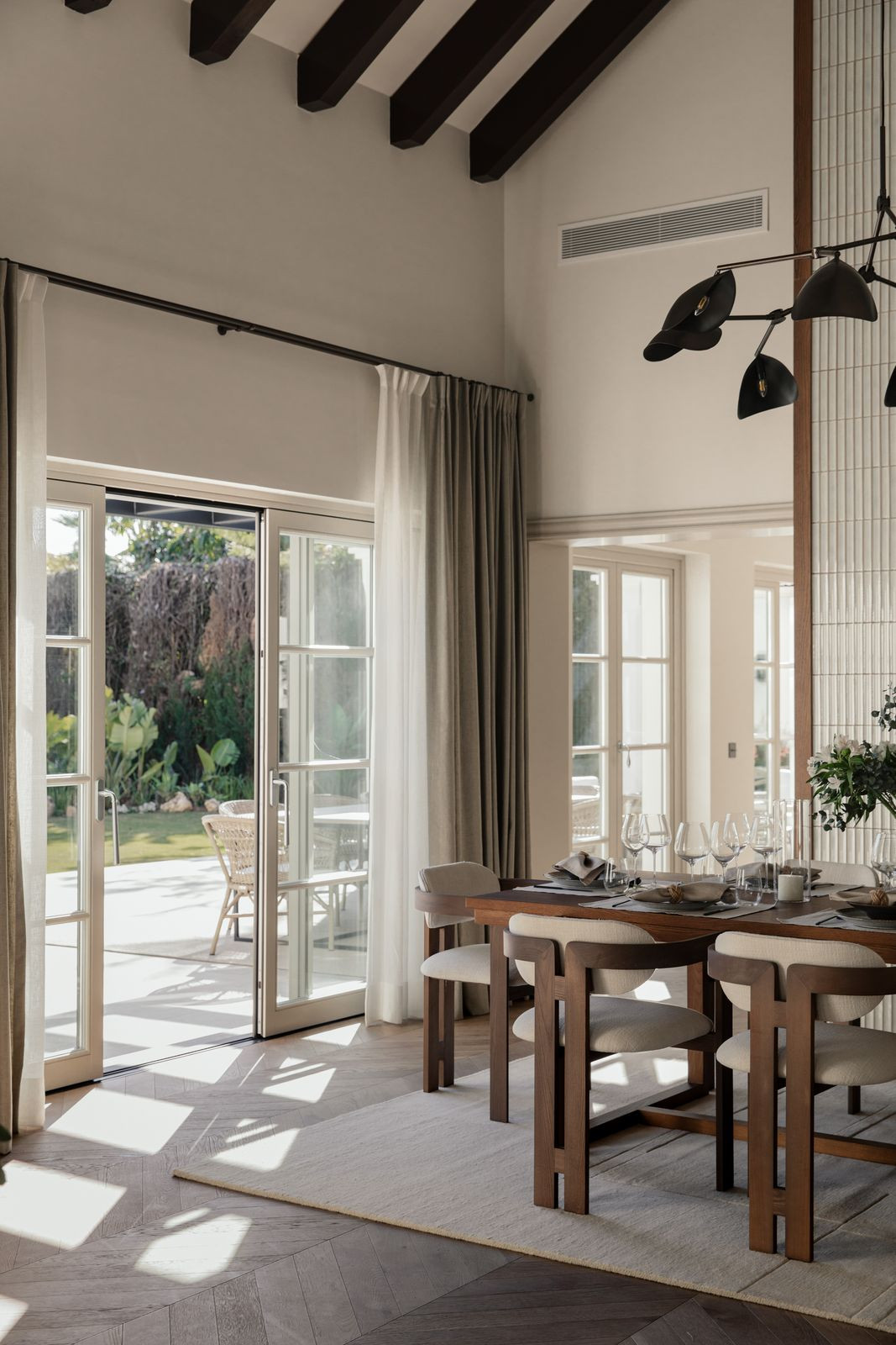 At the heart of the home is a beautifully tailored kitchen, marrying functionality with high-end design. The open-plan living and dining area is a masterclass in contemporary interior design, featuring curated furnishings, a soothing neutral palette, and warm wooden details. High ceilings and direct access to the terrace enhance the indoor-outdoor flow, infusing the space with natural light and an airy ambiance.