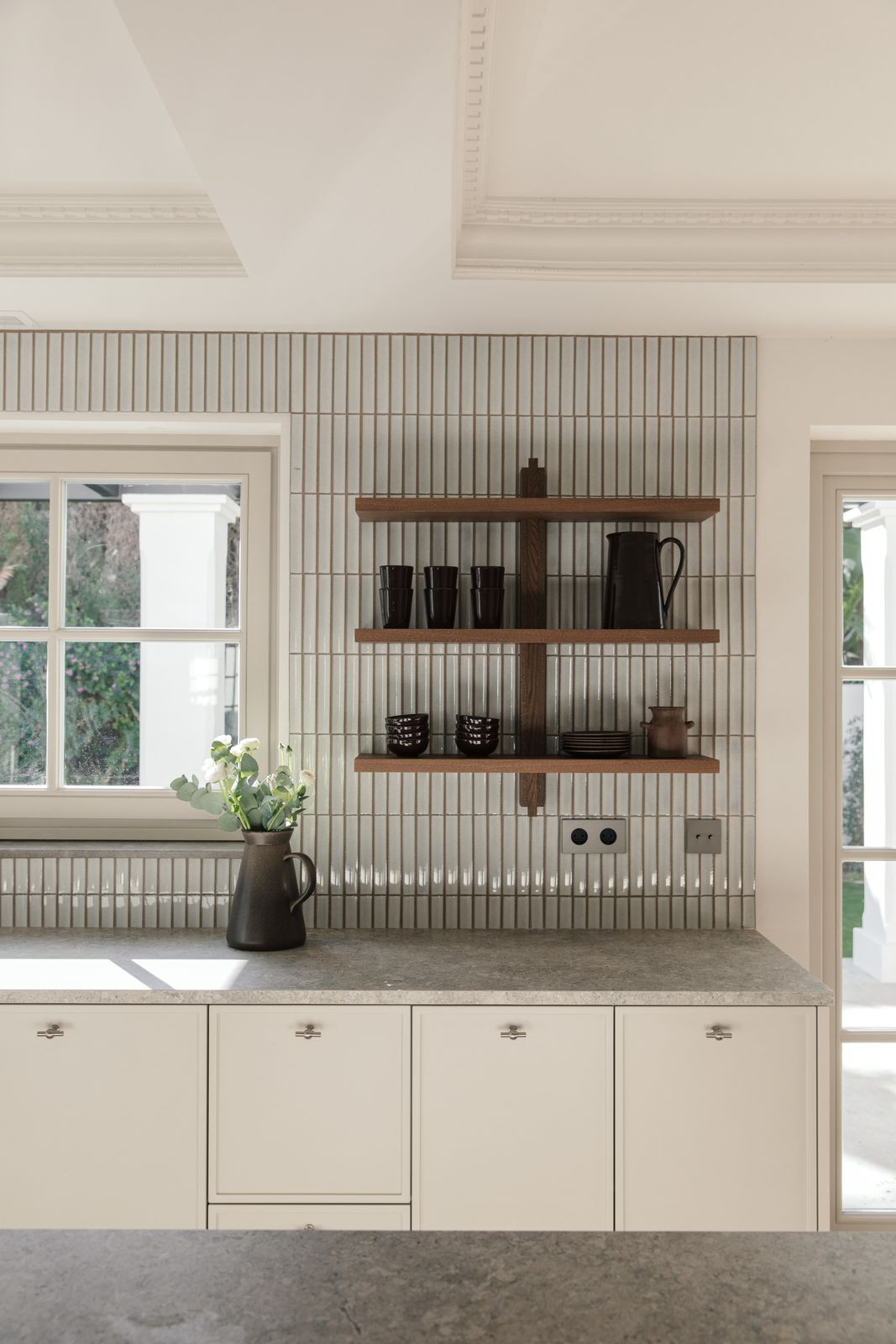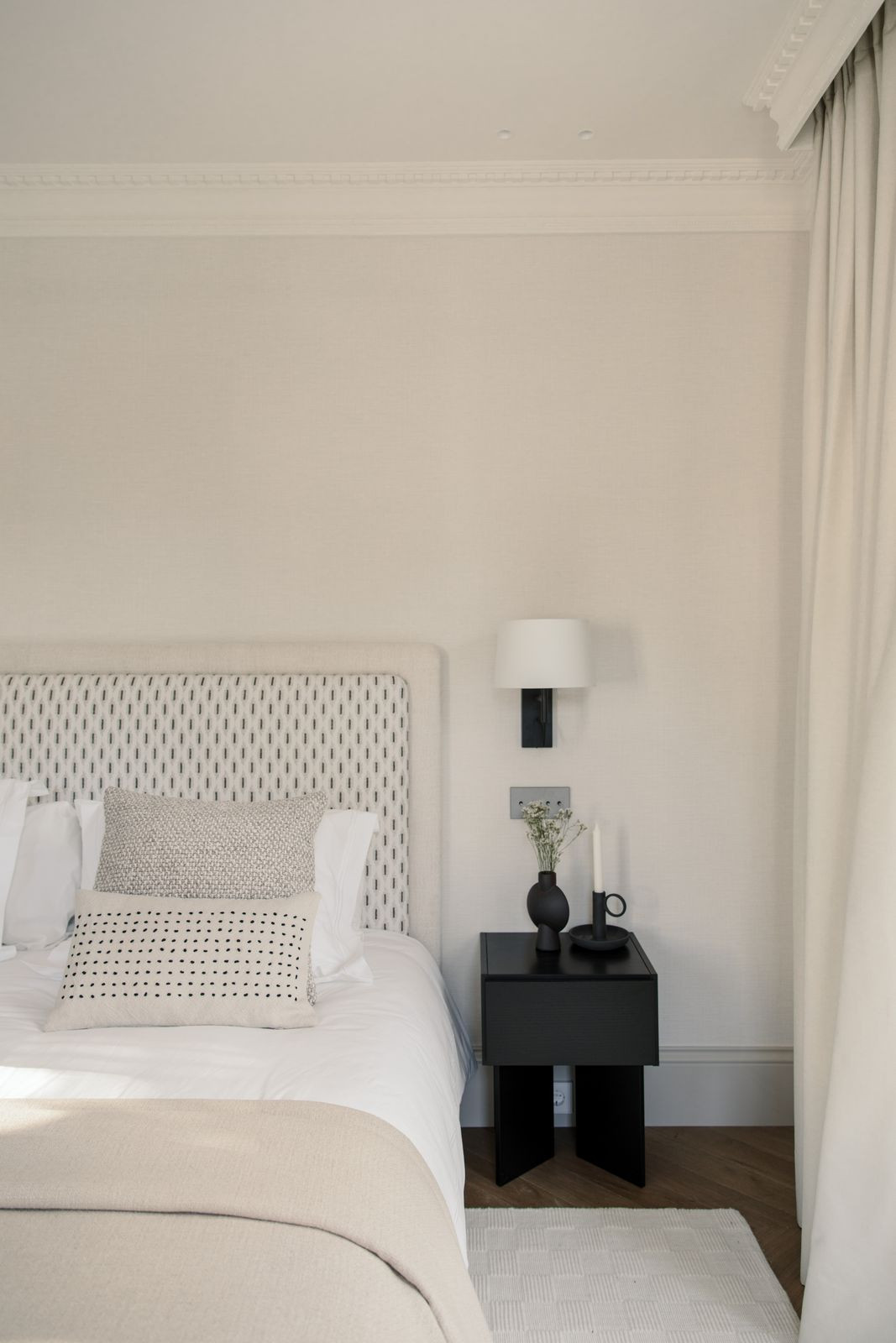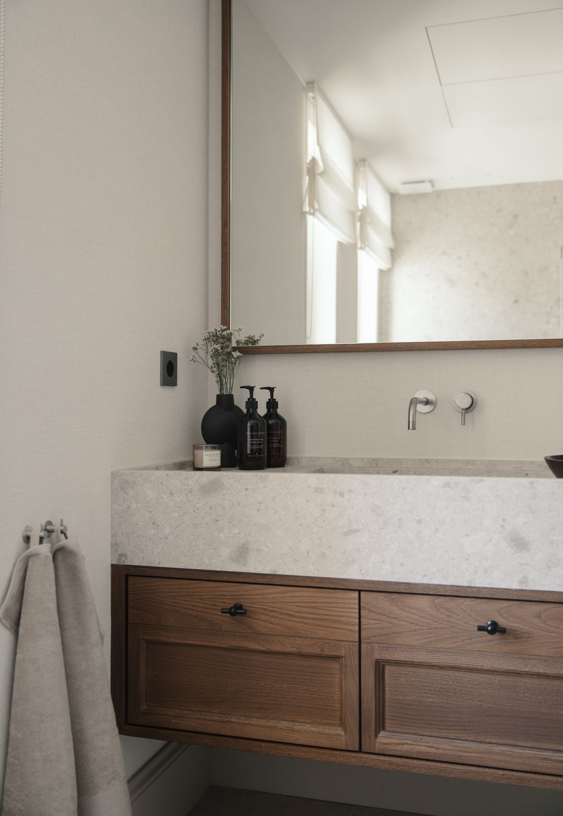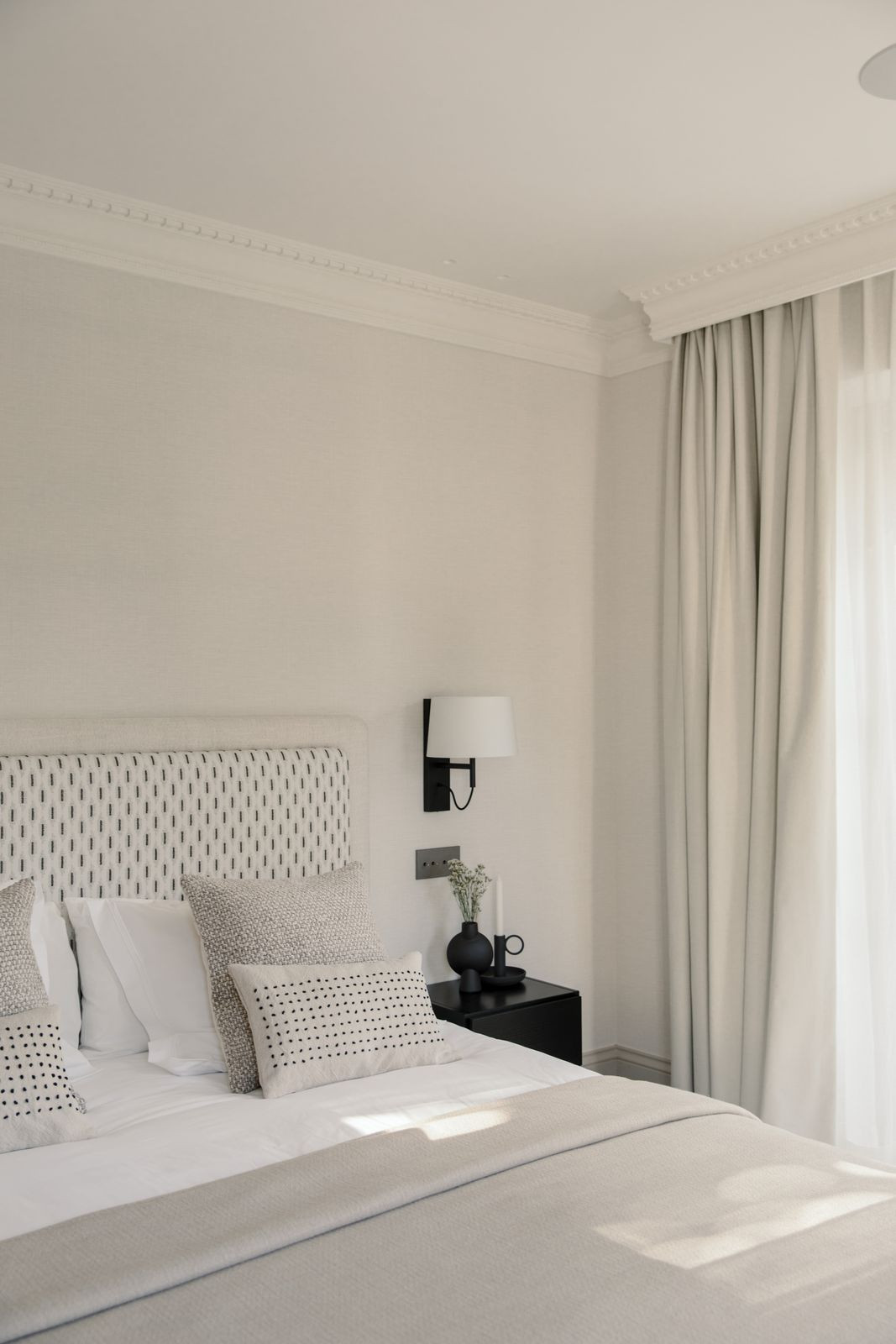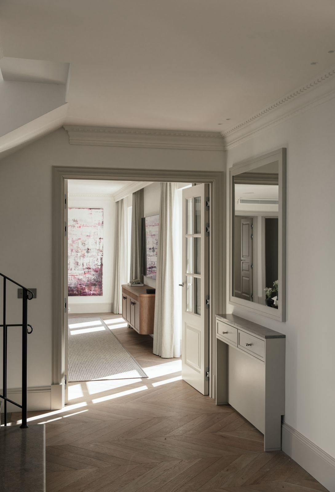 At the heart of the home is a beautifully tailored kitchen, marrying functionality with high-end design. The open-plan living and dining area is a masterclass in contemporary interior design, featuring curated furnishings, a soothing neutral palette, and warm wooden details. High ceilings and direct access to the terrace enhance the indoor-outdoor flow, infusing the space with natural light and an airy ambiance.