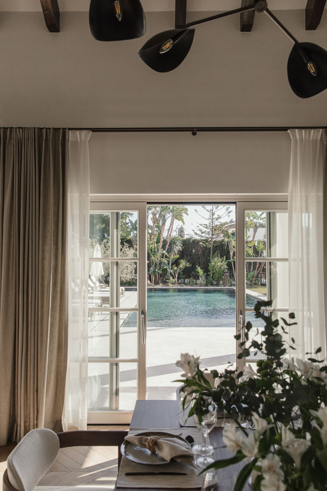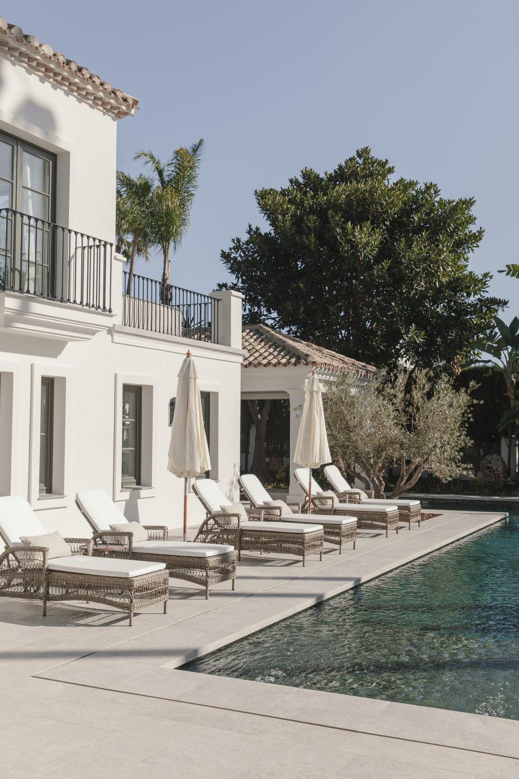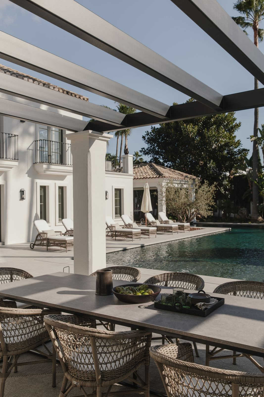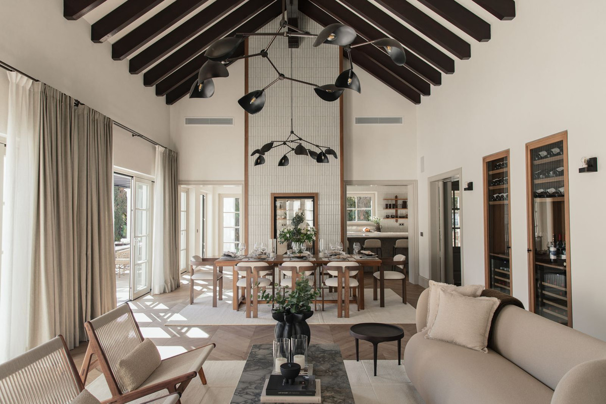 Recently built, the villa showcases outstanding craftsmanship and embraces a timeless Andalusian aesthetic with elegant architectural features. Covered porches provide shaded lounge areas ideal for relaxing under the Mediterranean sun, while expansive terraces invite alfresco dining and laid-back social gatherings. A sunken chill-out area with a custom-designed bar beside the private pool creates the perfect setting for unforgettable summer evenings.