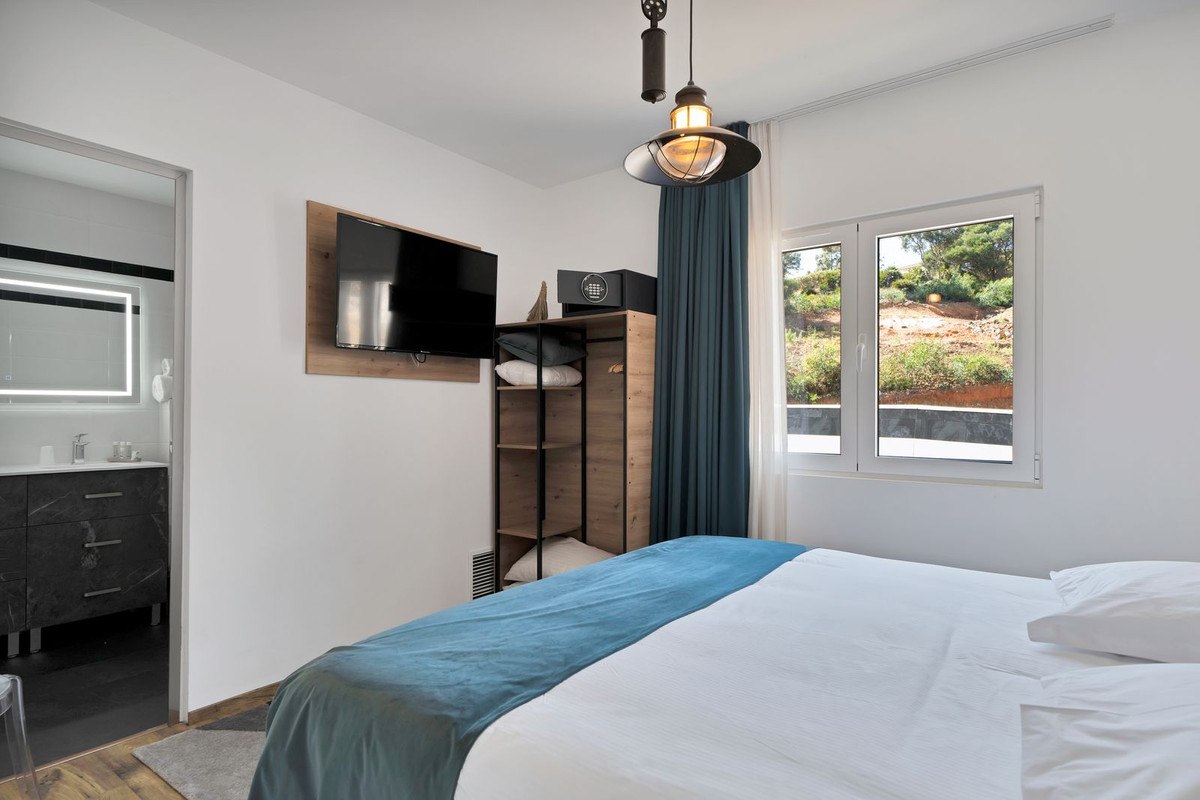 From the reception, you can access the sauna, jacuzzi, swimming pool, rooms, and kitchen-dining area. The first floor boasts six double en-suite bedrooms, a guest toilet, a large dining room, and a fully equipped kitchen, both with serene views of the pool and terrace access. The second floor offers nine double en-suite bedrooms and one quadruple en-suite bedroom, all with spectacular sea and open views.