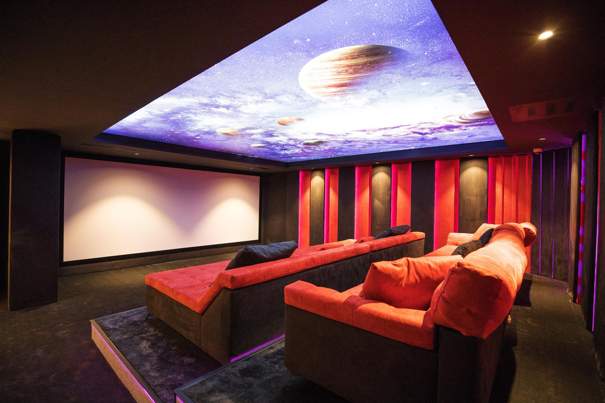 A sculptural staircase leads to the upper floor, where a guest suite with an adjoining bathroom, an office, a dressing room, and access to the terraces await, providing a private retreat for guests or residents seeking a quiet workspace. The basement is designed for functionality and entertainment, offering a spacious garage with room for up to six cars, as well as utility and storage spaces. Entertainment rooms in the basement expand options for leisure, making it the perfect space for gatherings and personal enjoyment.
